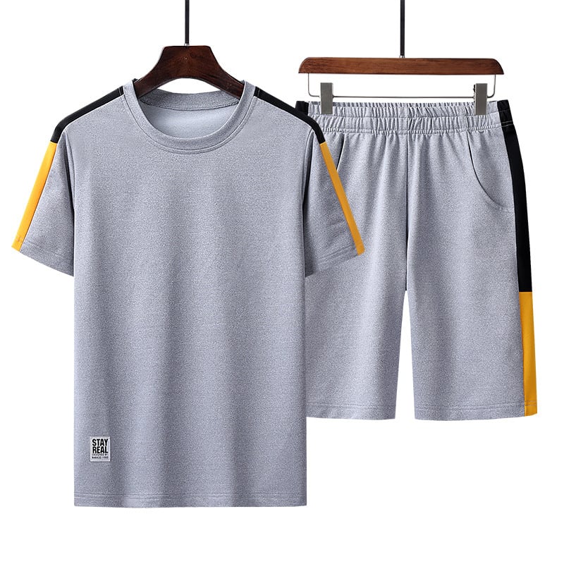 This men's summer running set features a two-piece design with a short-sleeve top and matching shorts. The lightweight and breathable fabric promotes airflow, helping to regulate temperature during warm weather activities. A round neckline and relaxed fit allow freedom of movement, making it suitable for training, jogging, and outdoor exercise. Available in multiple colors for versatile styling options.