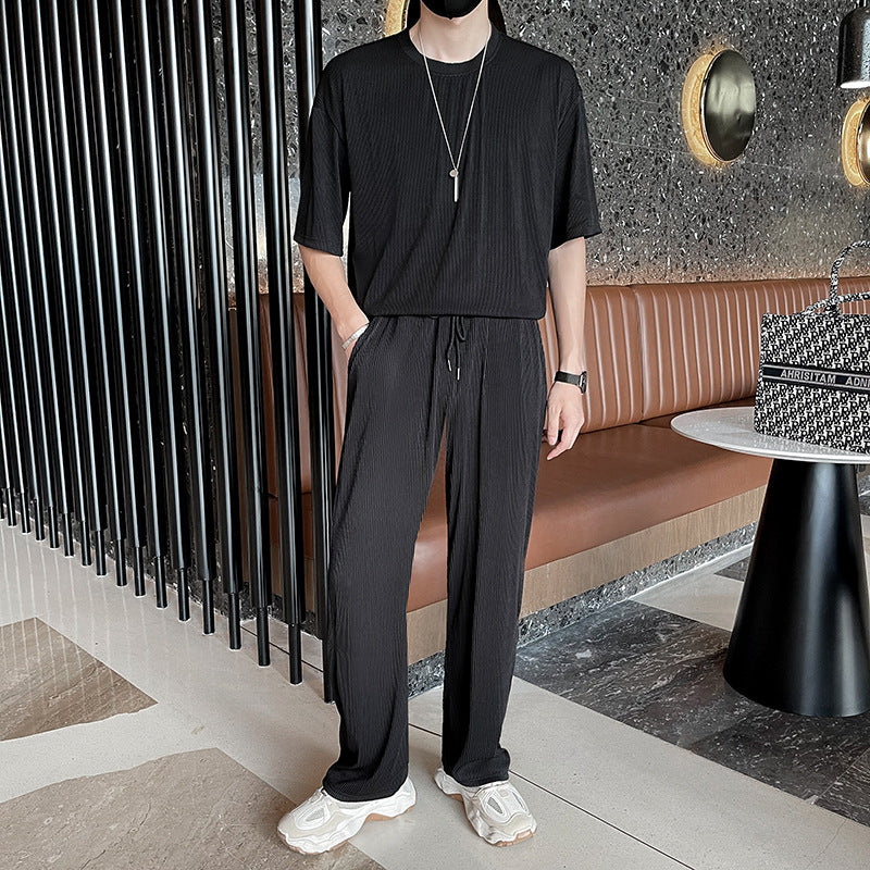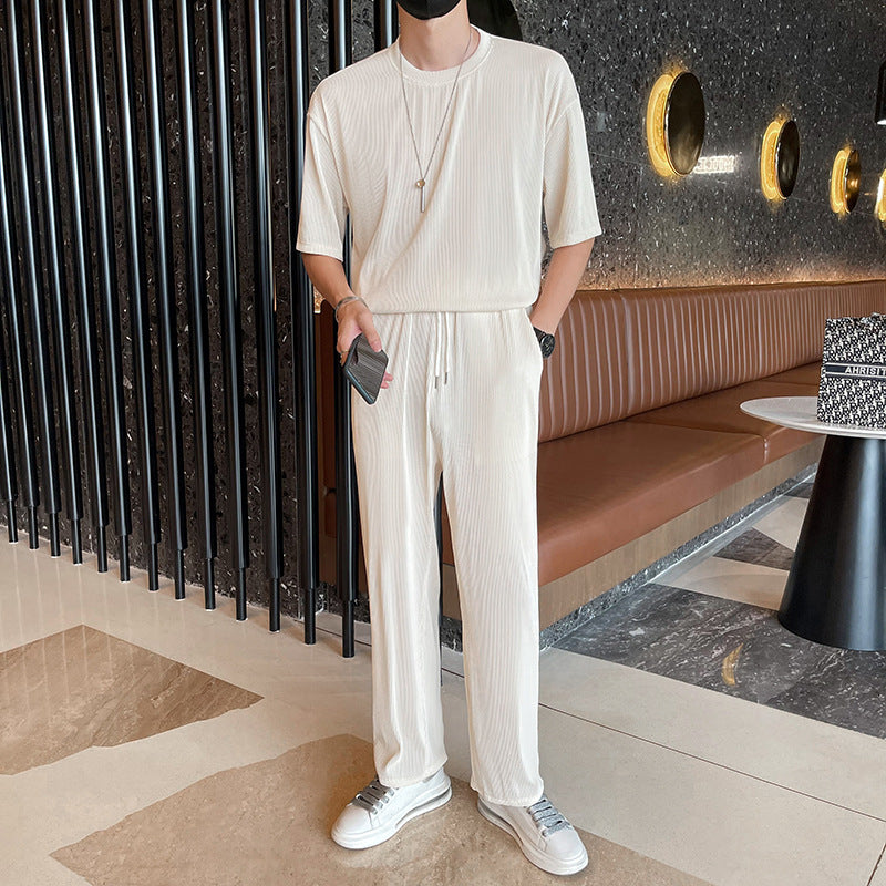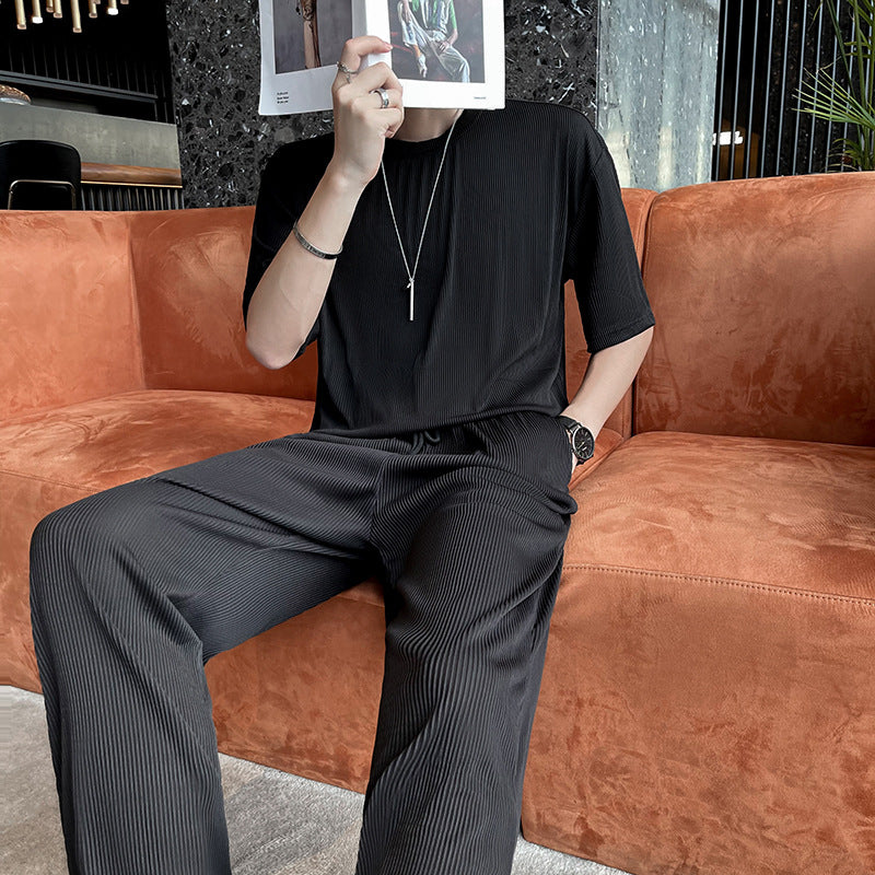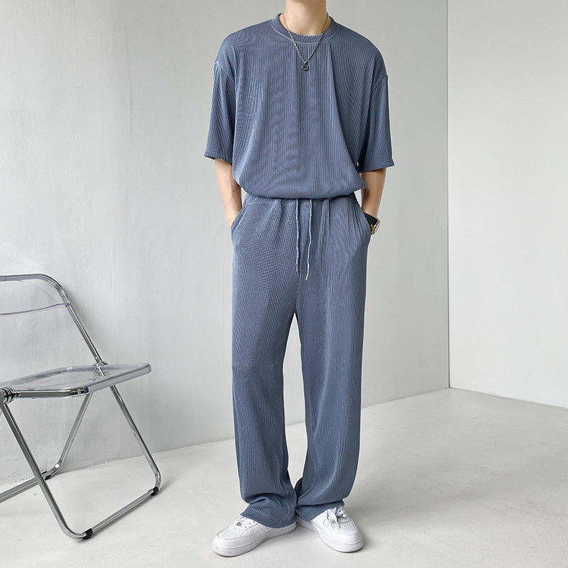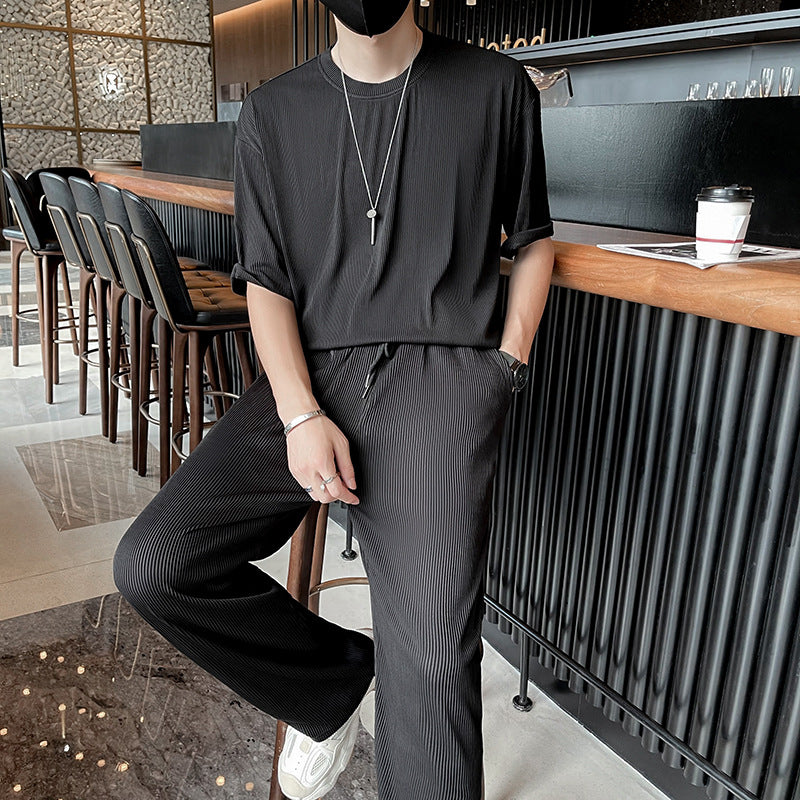 Men Summer Pleated Set Two-Piece Long Sleeve Top And Shorts