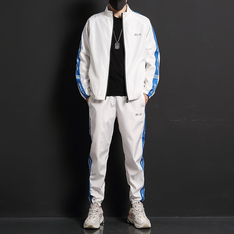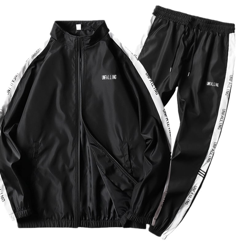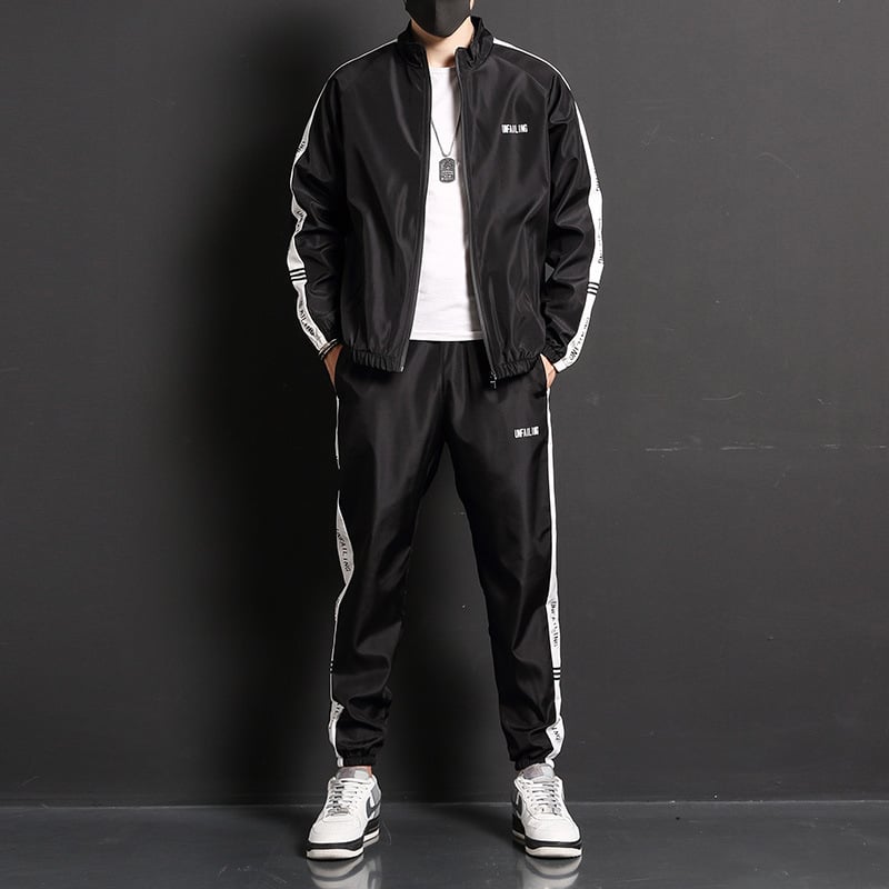 This men's two-piece sportswear set includes a long sleeve zip-up coat paired with matching trousers. Designed for spring, the set features breathable fabric suitable for moderate temperatures. The zip-up coat offers adjustable coverage, and the coordinated trousers support ease of movement. Available in classic colors, this set is intended for both indoor and outdoor activities requiring practical and functional wear.