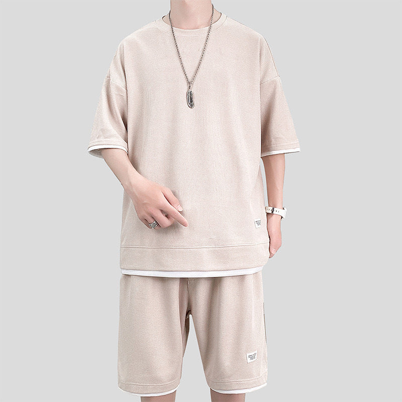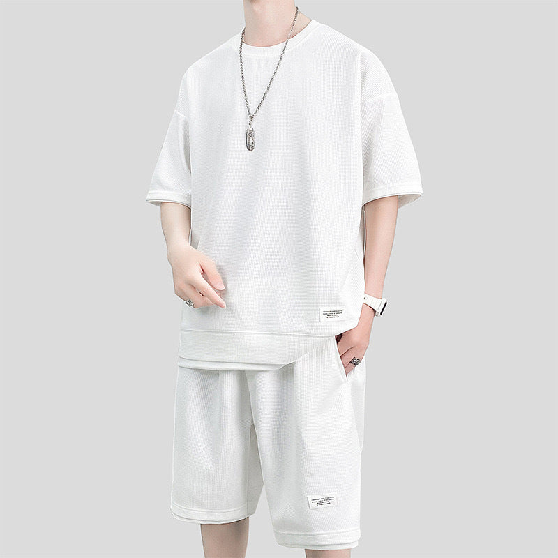 This men's summer sports suit features a two-piece set including a short-sleeve T-shirt and matching shorts. Designed with breathable waffle texture fabric, it enhances airflow for active wear in warm conditions. The lightweight construction supports a range of activities such as training, sports, and outdoor use. Multiple color options allow for varied styling preferences.