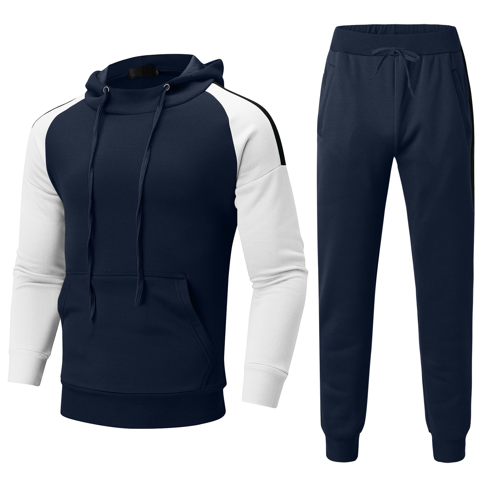 This men’s winter running set features a hooded top with a round neck and matching pants, designed for cold-weather activities. The loose fit supports movement during running, hiking, and other outdoor exercises. Made with velvet lining, the set provides added insulation. Decorative patches enhance the overall design. Available in multiple colors, it serves as a functional option for seasonal training wear.