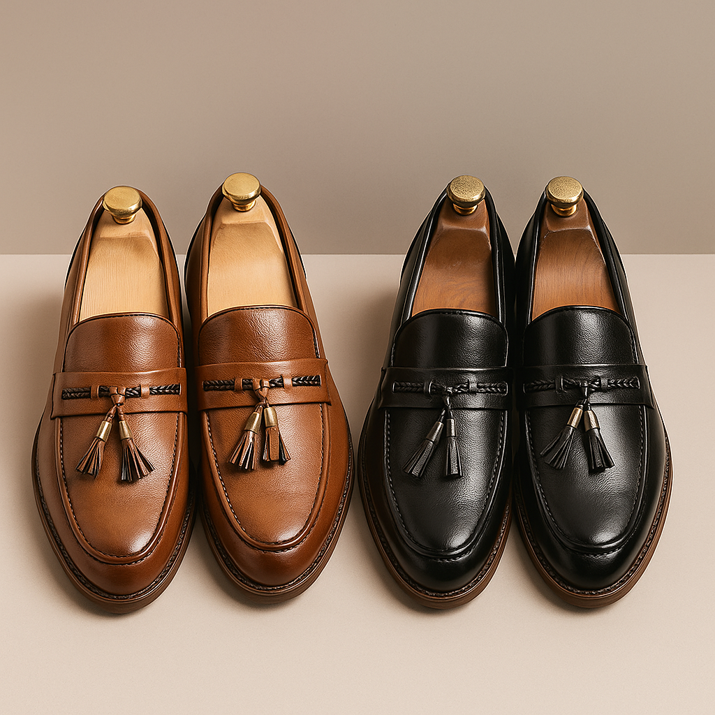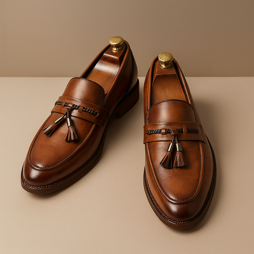 Men Loafers Burnished Upper Braided Tassel Strap Stitched Sole