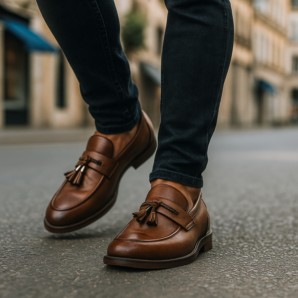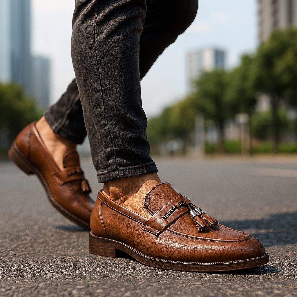 These men’s loafers feature a burnished upper with a braided strap and dual tassel detail arranged across the top. The insole includes added padding for regular use, while the stitched sole and low stacked heel provide a structured base suitable for daily and semi-formal settings. The slip-on layout keeps the design practical, offering a clean profile without unnecessary elements.