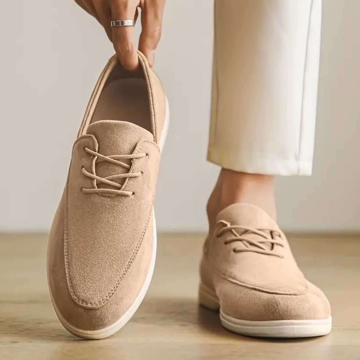 These loafers feature a suede upper with hand-stitched detailing and a cushioned insole for practical all-day wear. The lightweight rubber sole provides slip-resistant grip while maintaining flexibility for walking or standing. Designed with a breathable inner lining, they are suitable for pairing with chinos, jeans, or summer tailoring, offering a balanced combination of structure and versatility.
