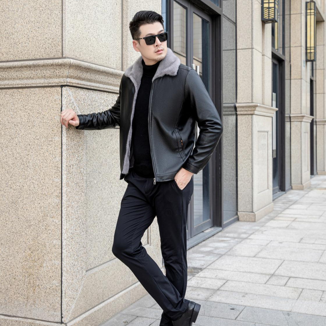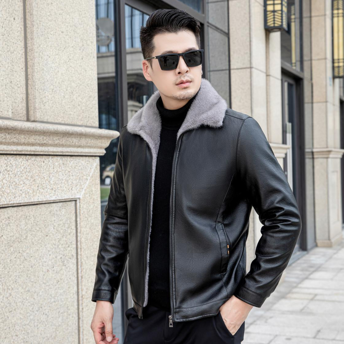 Men Winter PU Jacket With Fleece Lining And Zipper Pockets