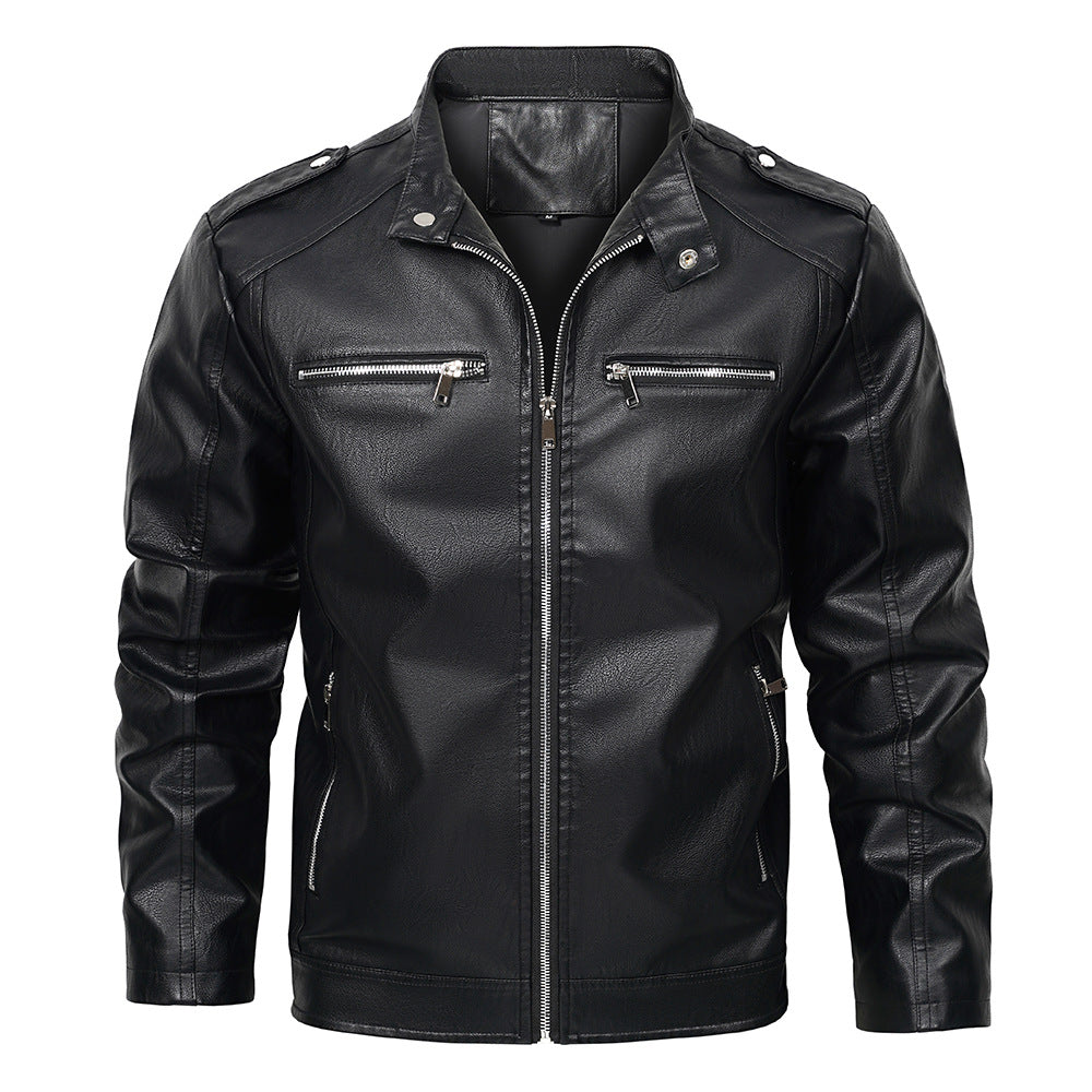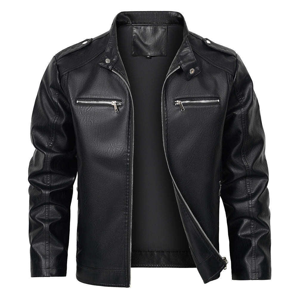 Men Autumn PU Jacket With Stand Collar And Zipper Pockets