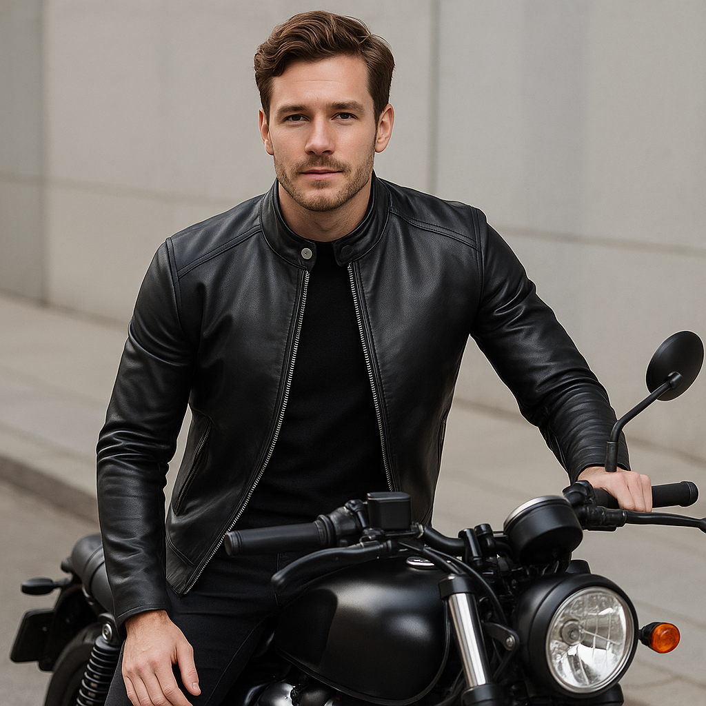 Experience the classic style of the Men's Biker Jacket with a Classic Slim Fit, designed to combine style with durability. This jacket offers the raw, iconic look of a traditional biker jacket, crafted from high-quality leather that will last in your wardrobe for years to come. With its minimalist design and no pockets, the jacket emphasizes clean lines and a slim silhouette that will work with a variety of styles, from casual to more elegant. Crafted from high-quality leather, it is a versatile accessory that exudes masculinity and timeless character.