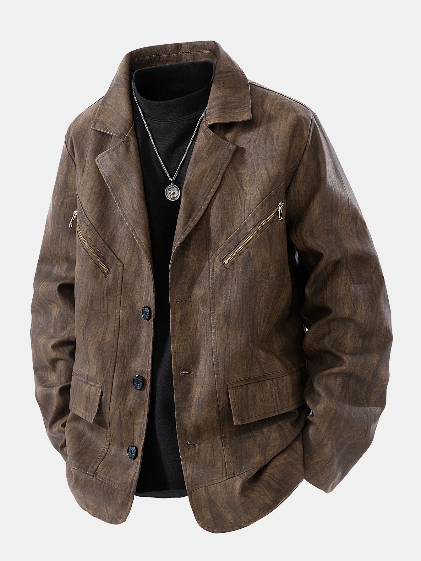 This men’s utility jacket features a textured surface with a structured collar and button front closure. Designed with multiple zip and flap pockets, it provides both storage and a defined appearance. The smooth inner lining allows for easy layering, while the tailored fit supports mobility without restricting movement. Suitable for daily wear, this jacket balances function and structure for versatile use across different settings.