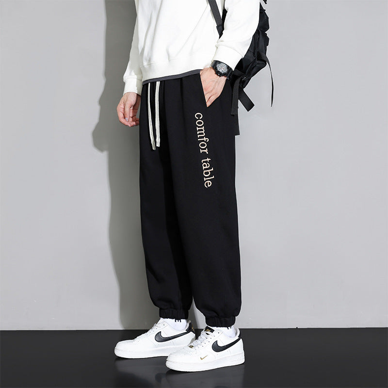 These men’s sweatpants feature a loose fit and ankle tie cuffs, offering a secure and adjustable finish at the hem. Designed with a mid-waist rise and made from micro elastic fabric, they provide flexibility during movement. Suitable for a wide size range, they can accommodate different body types and are practical for various informal activities and relaxed environments.