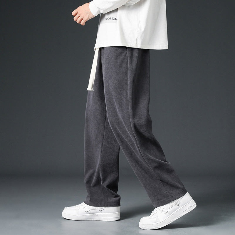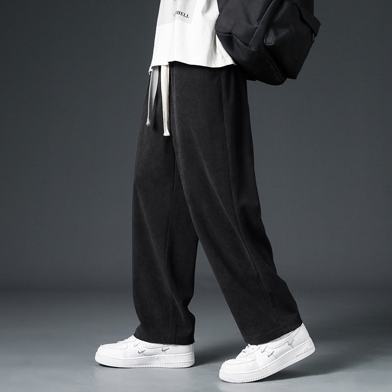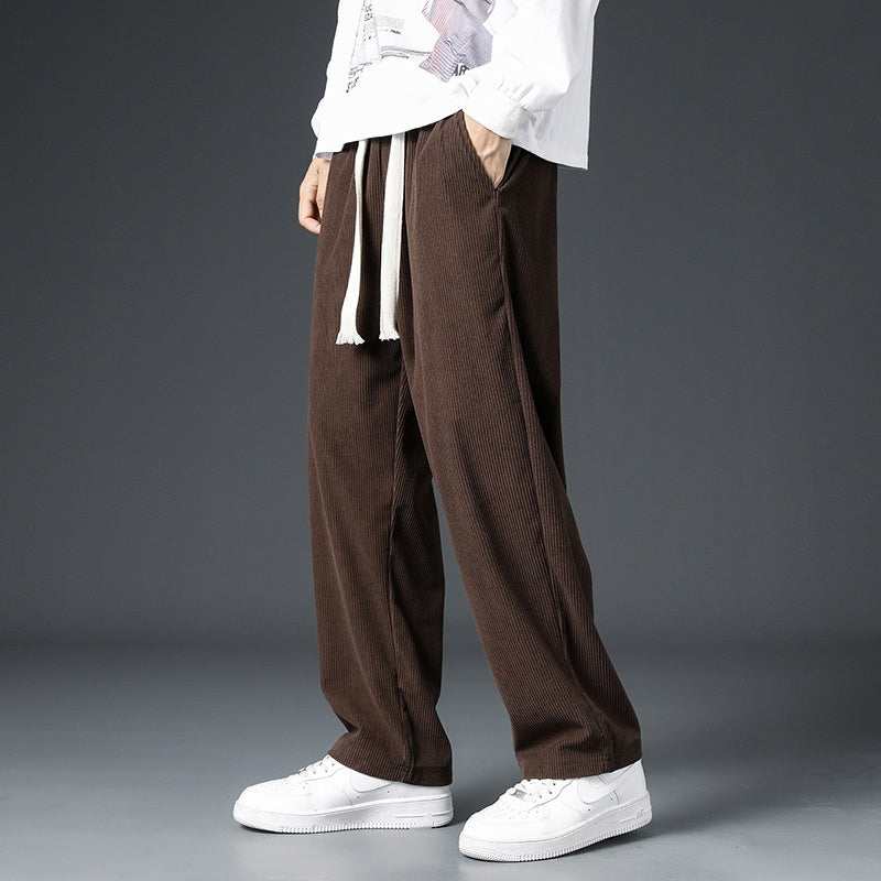 Men Fall and Winter Wide-Leg Corduroy Trousers with Fleece Lining and Drawstring Waist