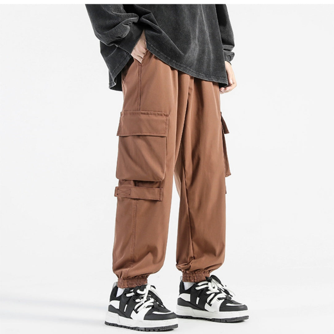 Men Wide-Leg Workwear Pants with Ankle-Banded Cuffs and Spacious Pockets