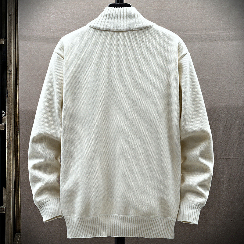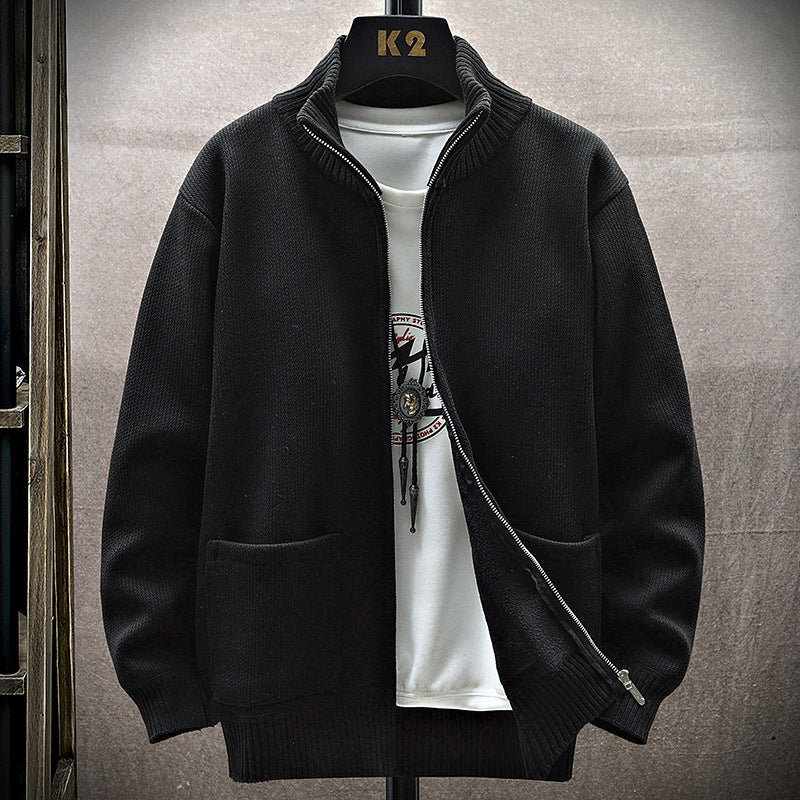 This winter cardigan features a fleece-lined interior and a full-zip design for added coverage during colder months. The stand collar helps shield the neck, while the long sleeves and relaxed fit offer ease of movement. Suitable for layering over shirts or under jackets, this piece supports practical styling in low temperatures. The clean design makes it compatible with a range of everyday outfits.