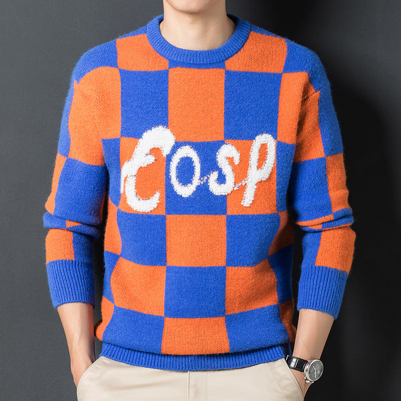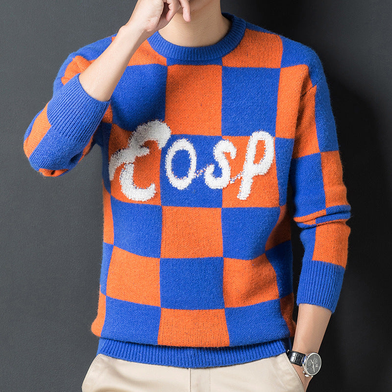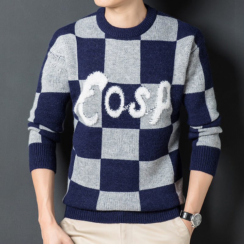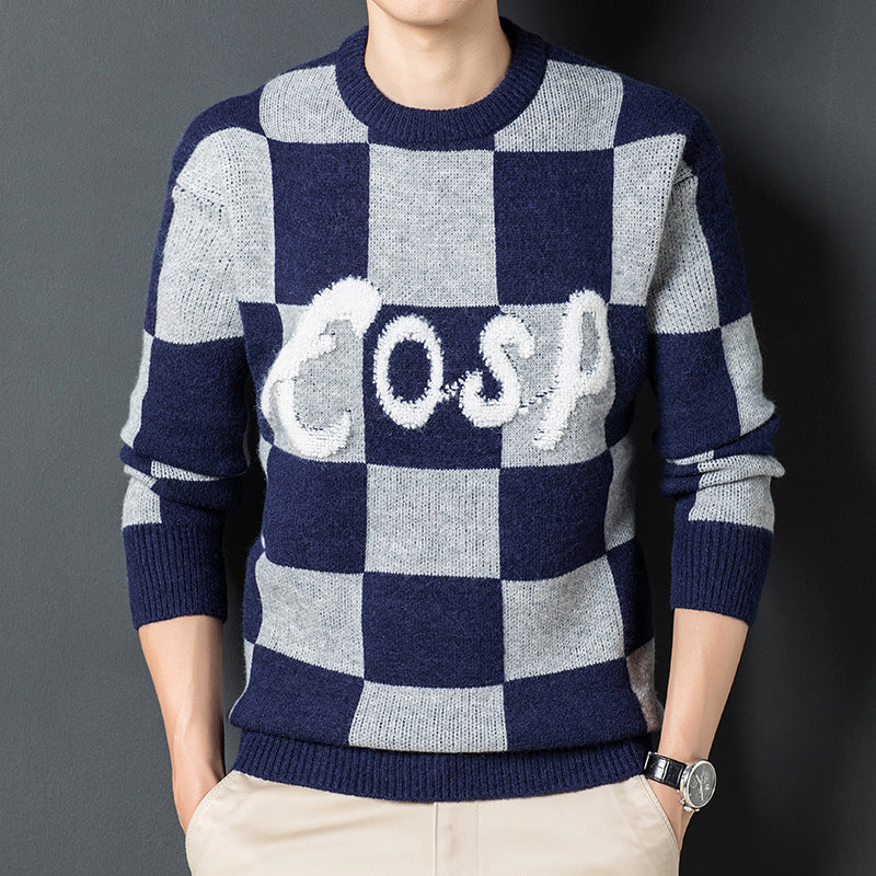 Men Winter Pullover Sweater Slim Fit Thickened Plaid Knit