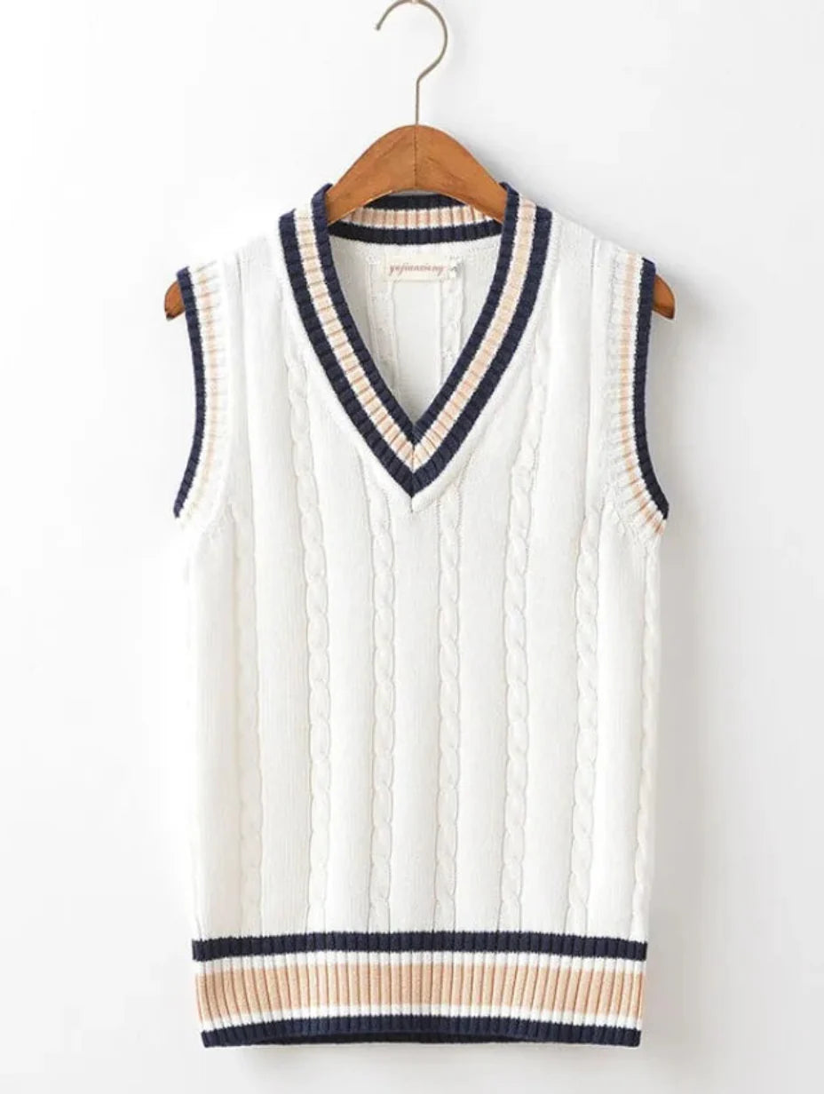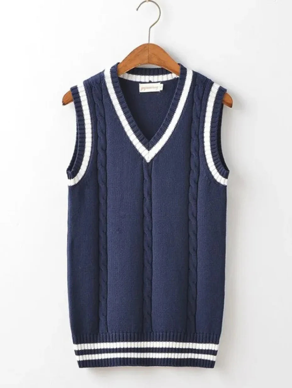 This sleeveless sweater vest features a clean V-neck opening and a pullover structure suited for layered outfits. The sleeveless cut allows unrestricted arm movement, making it suitable for wear over shirts in structured or everyday settings. Its balanced shape supports pairing with trousers, chinos, or uniform-style looks, while the simplified surface keeps the design adaptable across different uses. The vest is designed for regular wear where layering and ease of styling are required without added bulk.