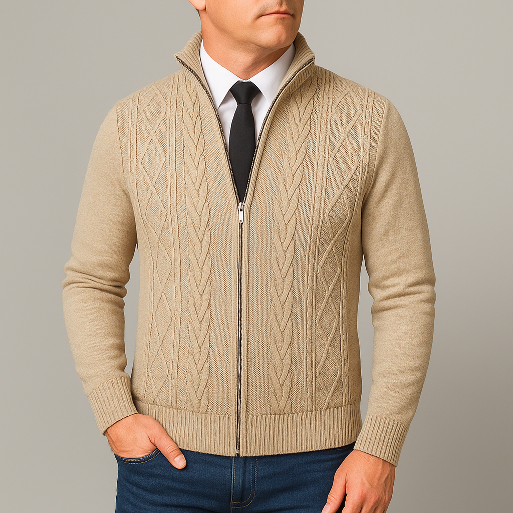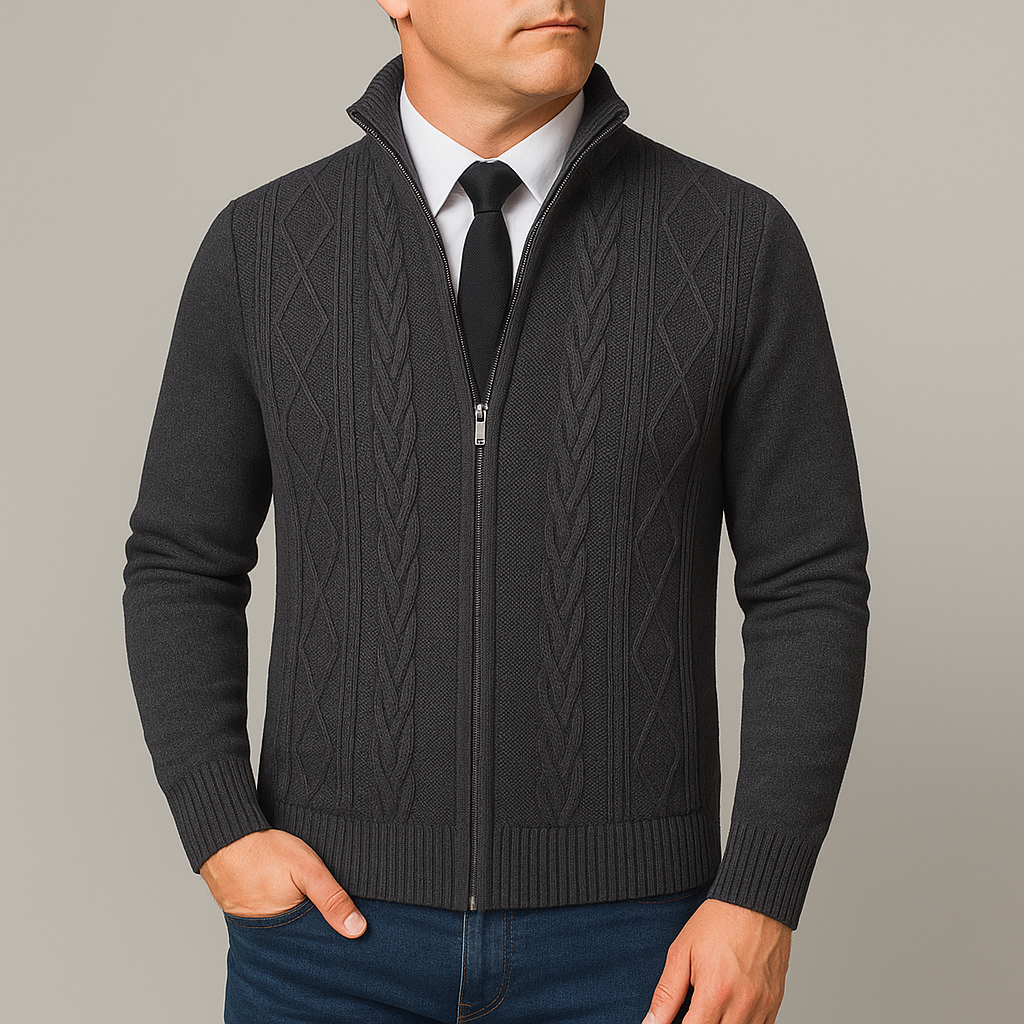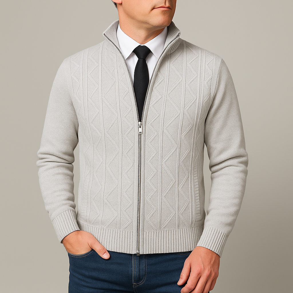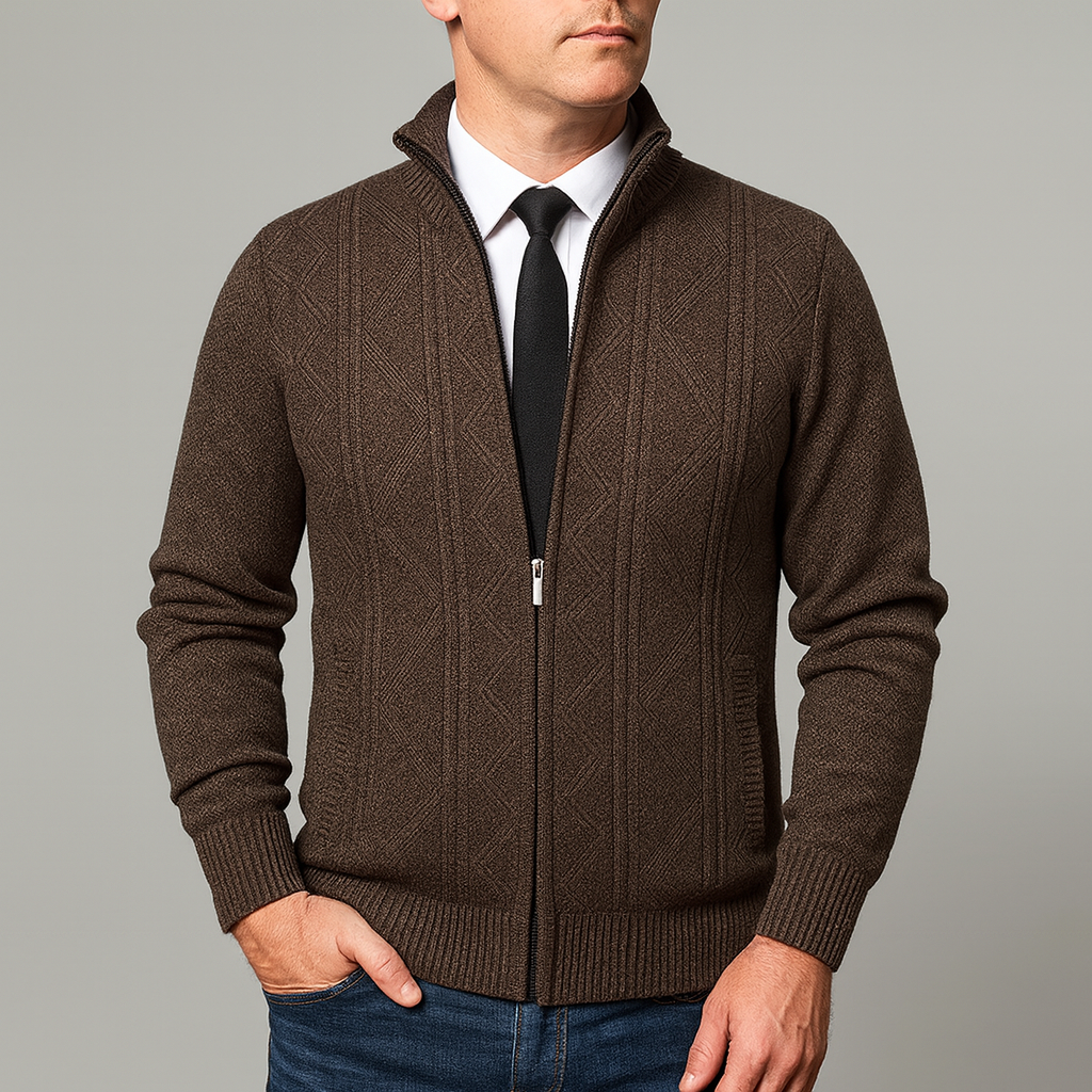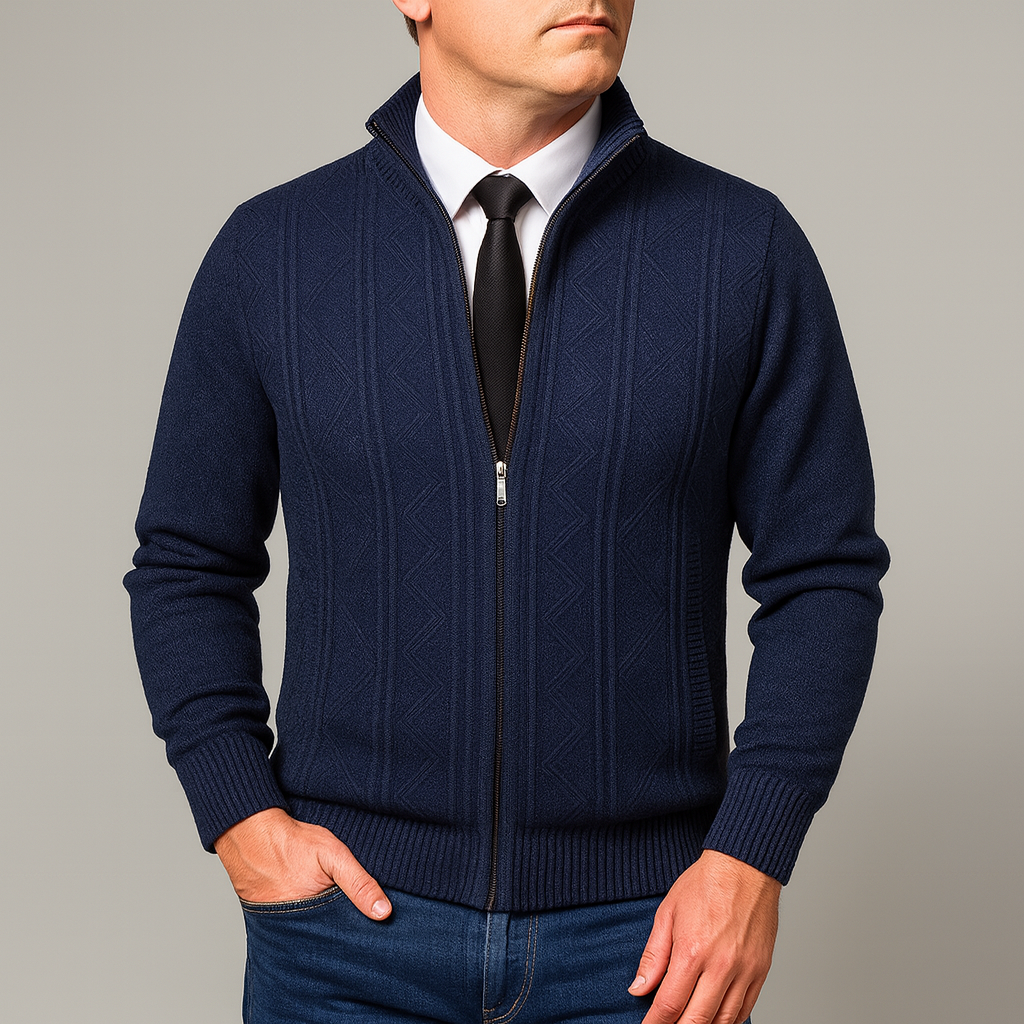 This knit sweater is designed for autumn wear with a structured build suitable for daily use. The stand collar adds coverage around the neck area, while the full zip closure allows easy layering and straightforward wear. The patterned knit surface introduces visual definition without additional detailing, making it appropriate for both work-related and everyday settings. Its balanced cut supports use over shirts or lightweight layers, offering flexibility across different outfits during cooler months.