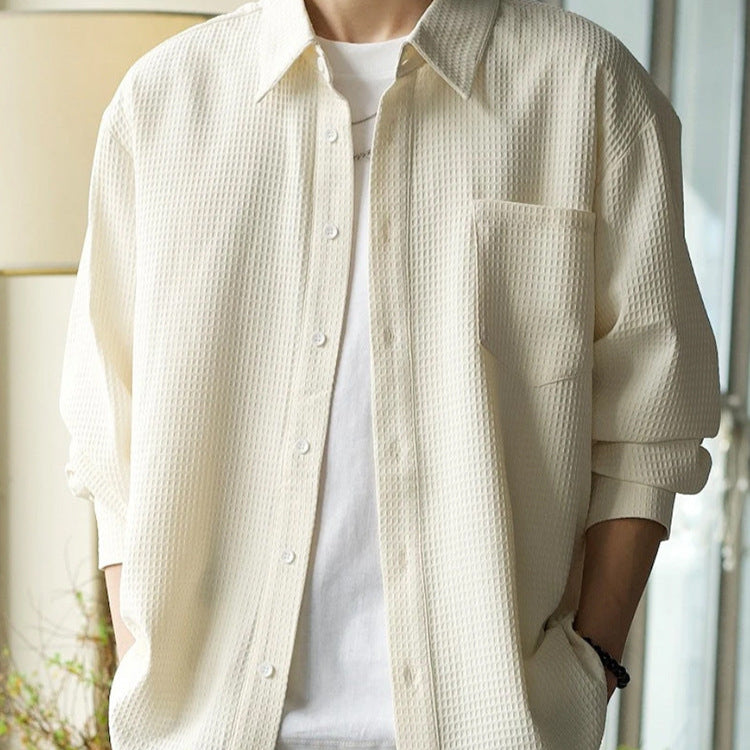 This men’s long sleeve cardigan shirt features a lightweight design ideal for summer wear. Constructed from polyester fiber, it offers easy care with a non-iron finish. The loose fit and solid colors provide versatility for pairing with various outfits. Available in black and apricot, this shirt comes in sizes ranging from M to 3XL.