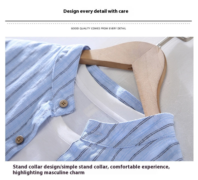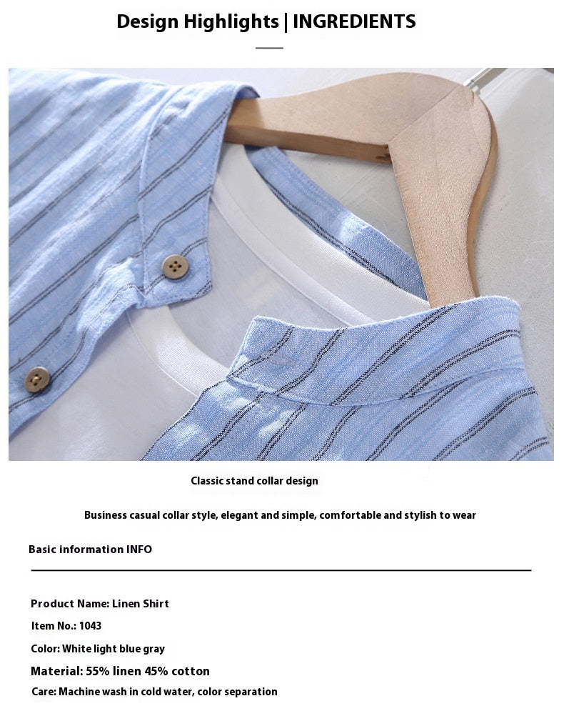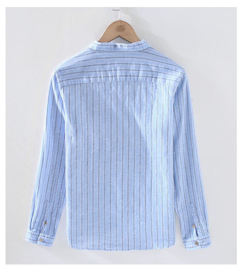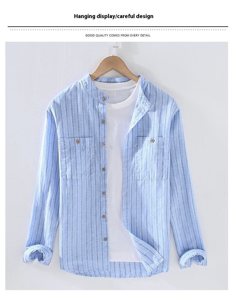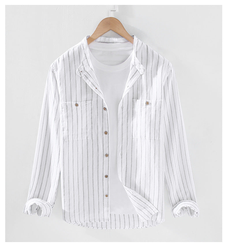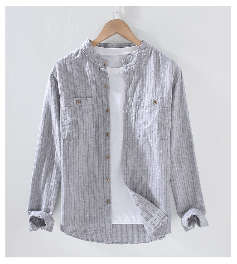 This long-sleeve blouse features a stand collar and double-pocket design, offering a clean and structured look. The yarn-dyed striped pattern adds subtle texture, and the relaxed fit makes it suitable for daily wear. Available in multiple colors, it can be paired with a variety of bottoms for versatile styling.