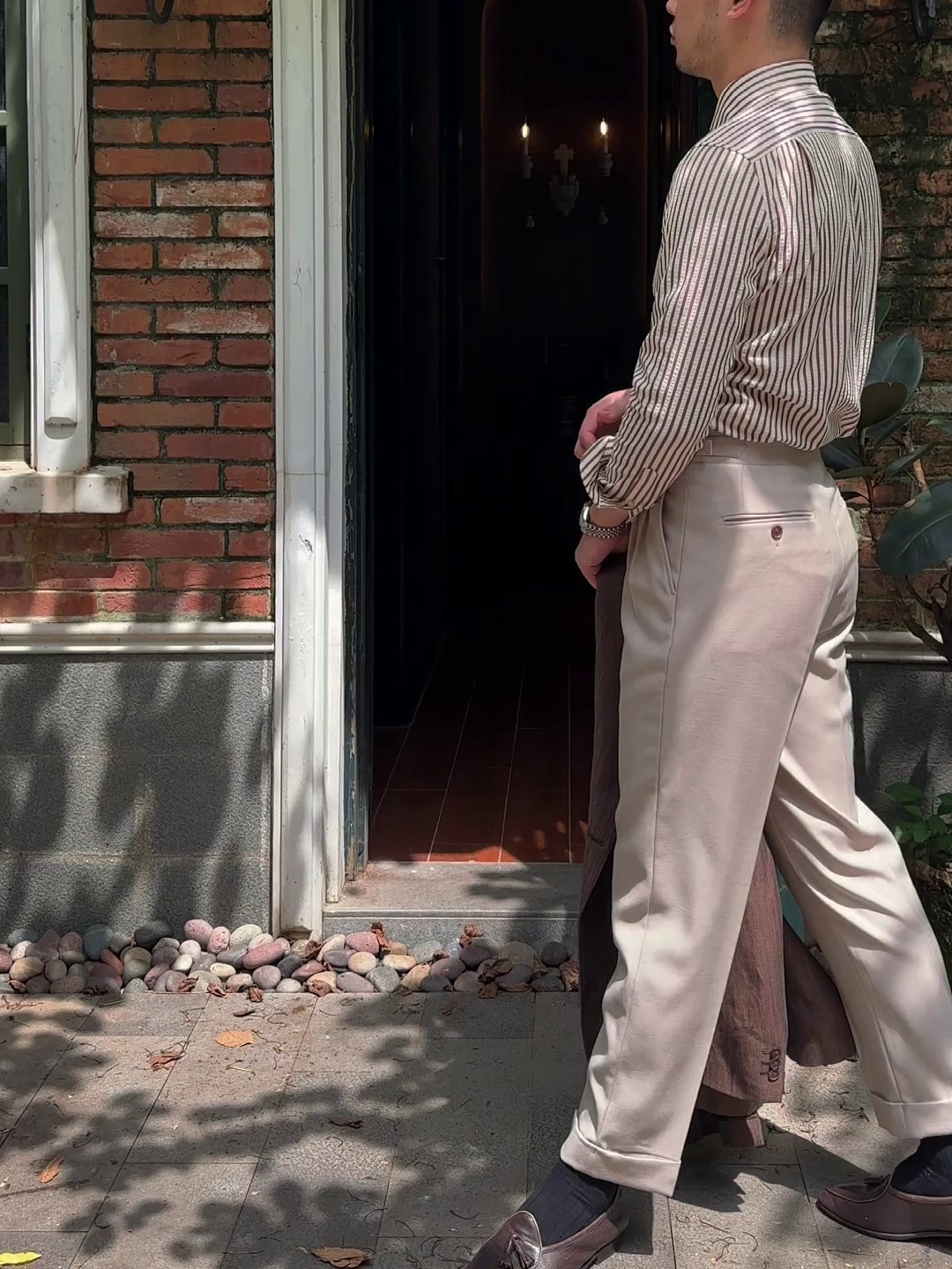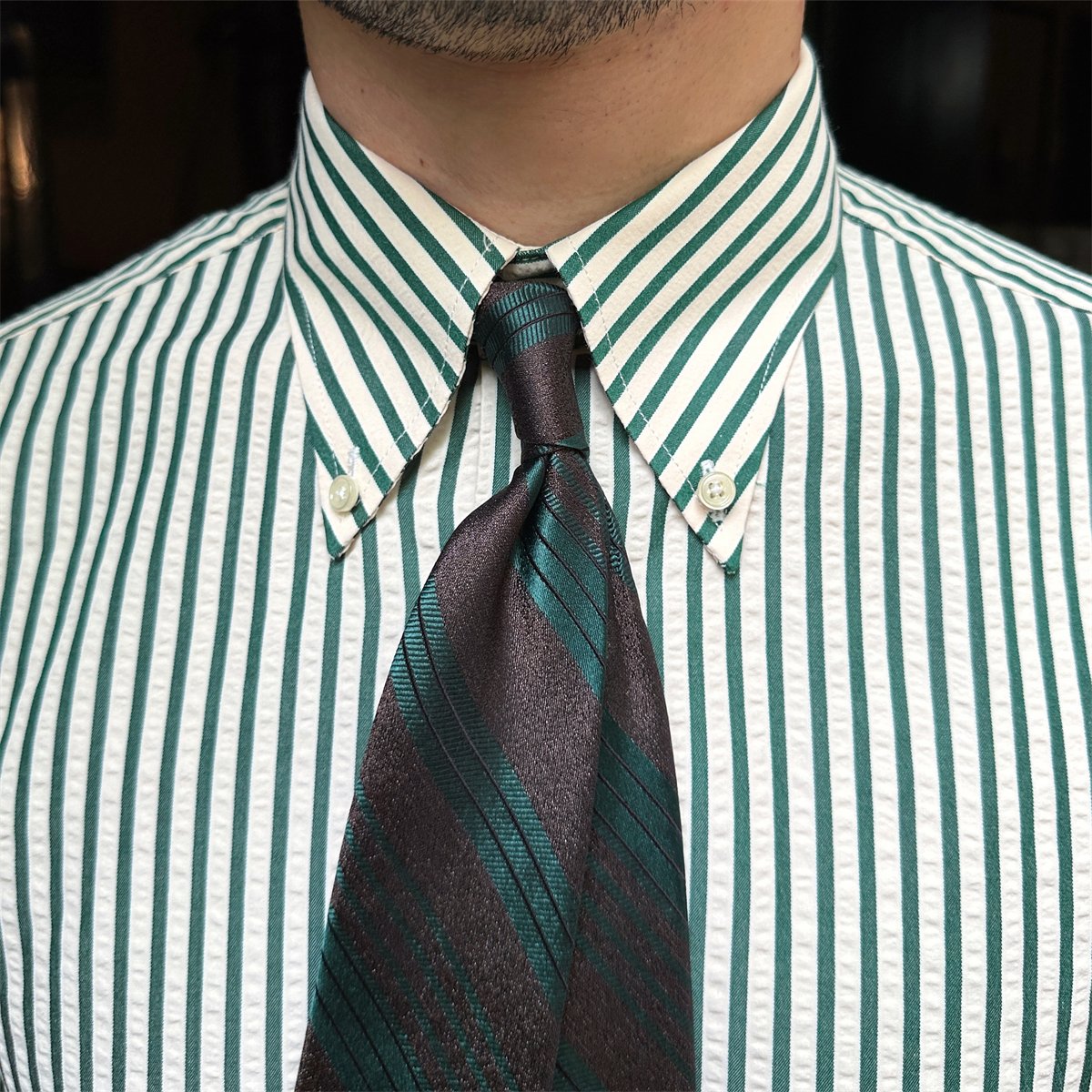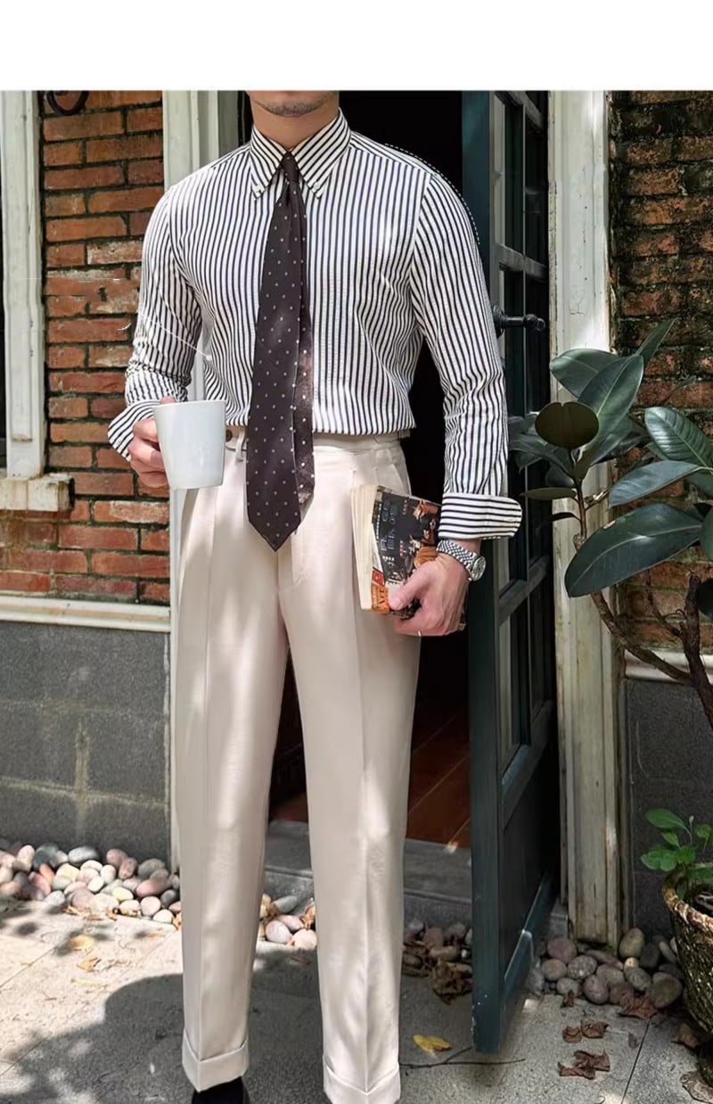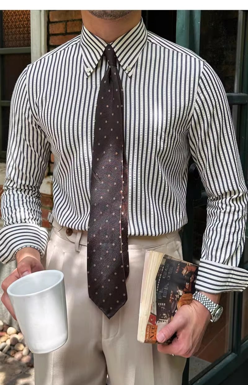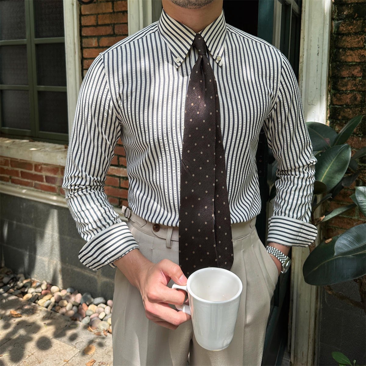 This men's long-sleeved shirt features a pointed buckle collar and a striped design, offering a structured yet relaxed fit suitable for daily wear. Available in blue, green, and brown, it pairs easily with various bottoms and can be worn for both leisure and semi-formal occasions.