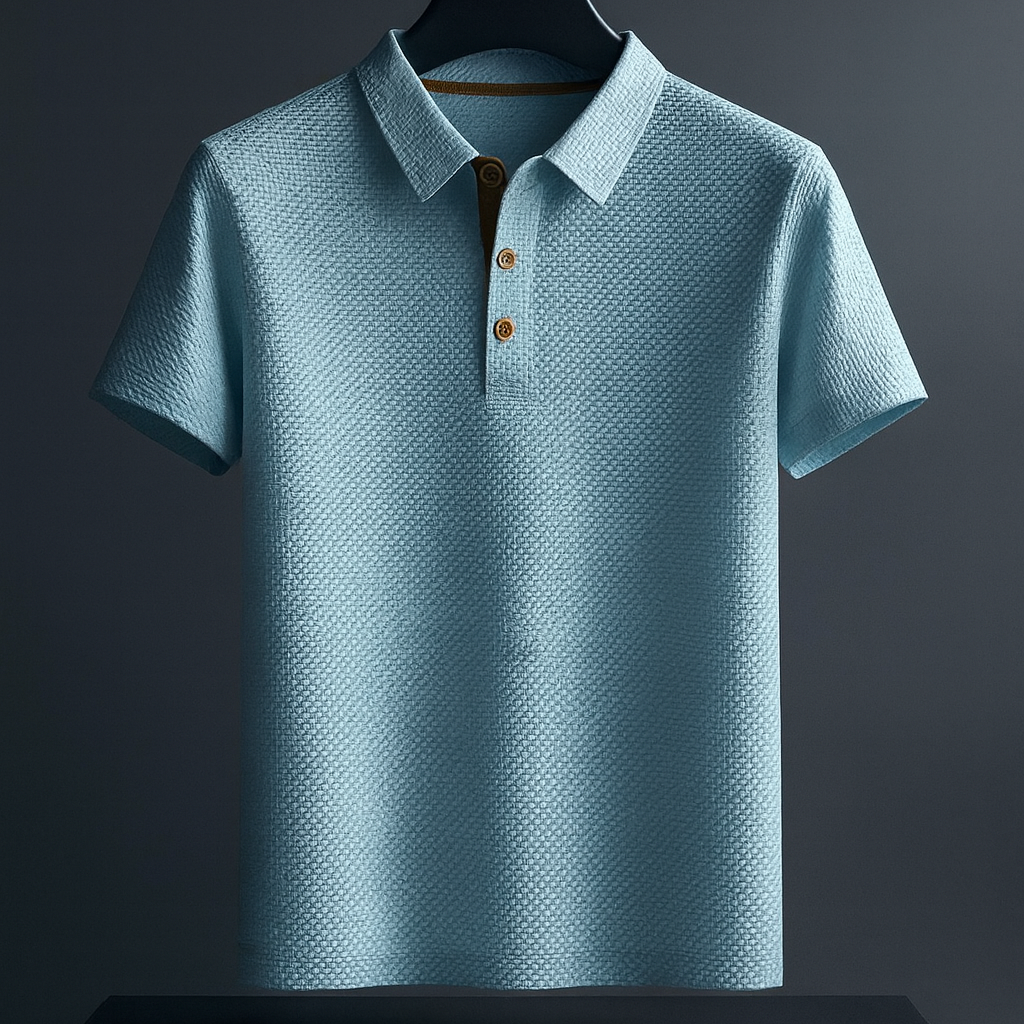 This men’s polo shirt is designed with a clean lapel collar and a three-button front for a structured, modern appearance. The short sleeve cut supports ease of movement, while the stretch construction allows the garment to adapt to different body shapes. A streamlined silhouette keeps the look suitable for everyday wear, work settings, or social occasions without relying on decorative elements. The pull-on design pairs easily with trousers or shorts, offering a balanced option for regular rotation.