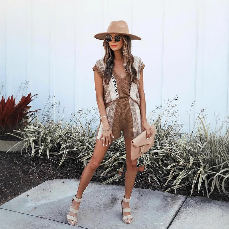 Female Spring Knitted V-Neck Pullover and Shorts Set with Loose Fit