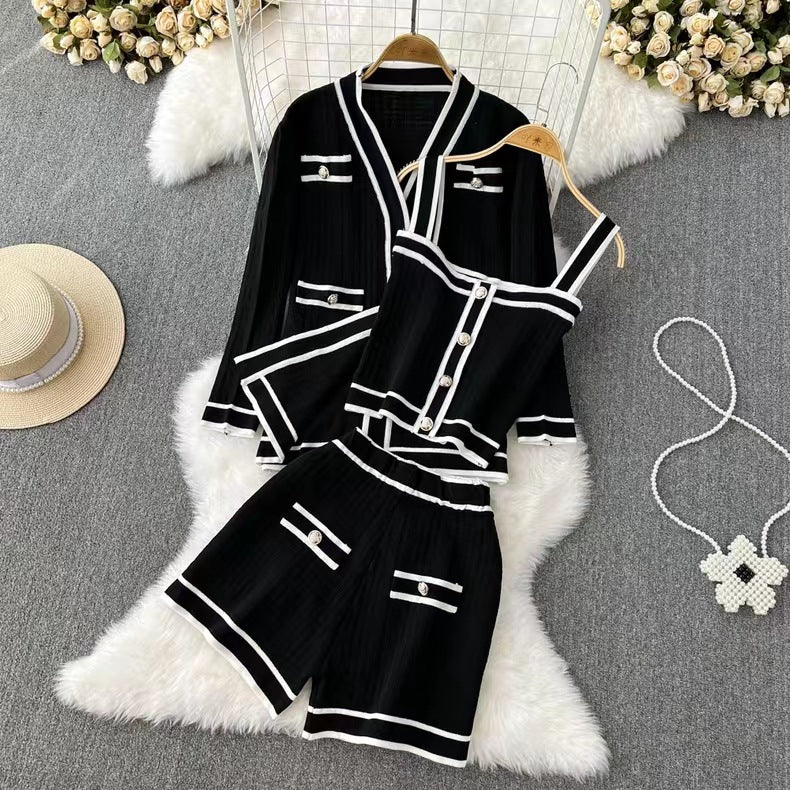 A coordinated three-piece knitted set including a V-neck cardigan with contrast color detailing, a matching top, and a skirt. The viscose fiber fabric offers breathability and flexibility, suitable for a range of occasions. The splicing design elements enhance the overall structure of the set, providing options to wear the pieces together or separately.