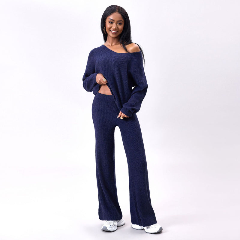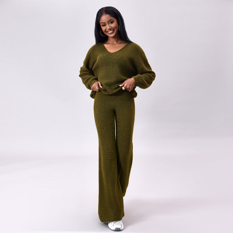 A knitted two-piece set featuring a long-sleeve top and matching bottoms with a textured sunken stripe pattern. Designed for layering or standalone wear, the set offers a soft feel with subtle visual detail. Available in multiple colors including army green, brown, and dark blue, it suits a range of styling options for cooler weather.