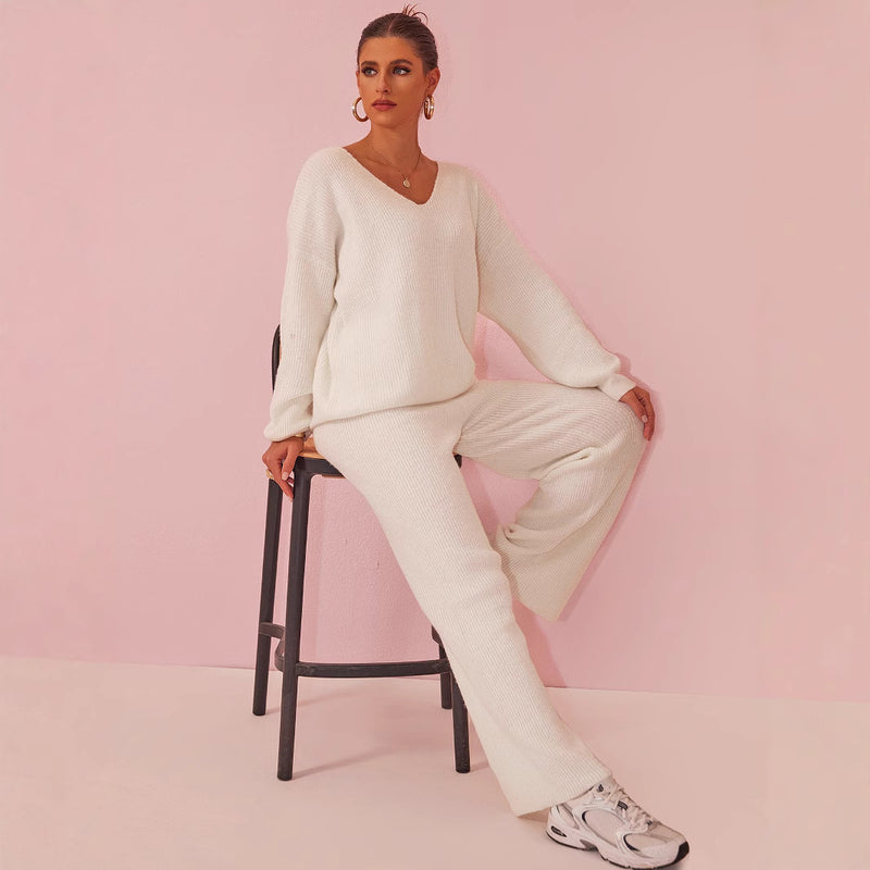 Female Autumn Knitted Two-Piece Set with Long Sleeves and Sunken Stripe Texture
