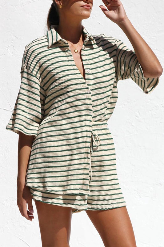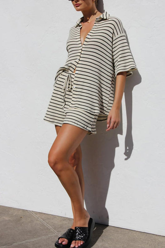 Designed for warm-weather wear, this two-piece set includes a quarter-sleeve raglan shirt and coordinating shorts. The waffle texture adds structure to the striped pattern, while the relaxed fit allows for ease of movement. The lightweight design makes it suitable for daily wear or leisure. Available in sizes S to XXL, this set combines a functional cut with a simple visual finish.