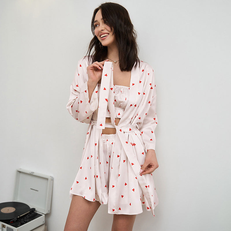 Women Spring Three-Piece Pajama Set with Long Sleeve Top, Shorts, and Outer Layer
