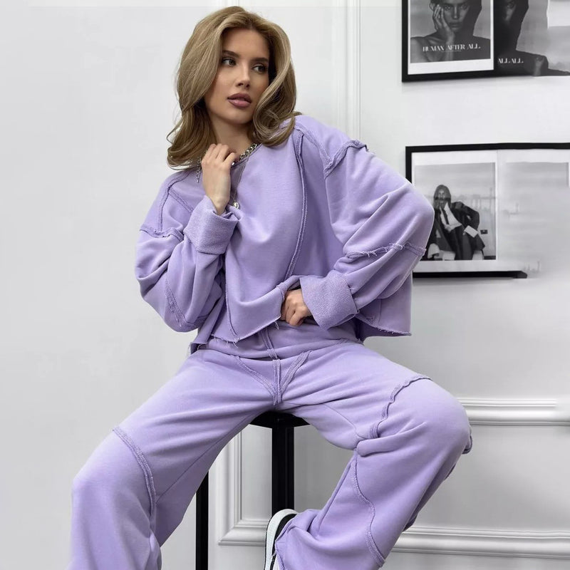 This set features a long-sleeve knit sweater with a splicing detail and straight-leg trousers designed for fall wear. The fabric offers breathability while providing moderate insulation for cooler temperatures. The sweater’s unique splicing adds subtle visual interest, while the trousers deliver a relaxed yet structured fit for daily activities. Available in purple and khaki, this set suits various settings, from home to outdoor use.