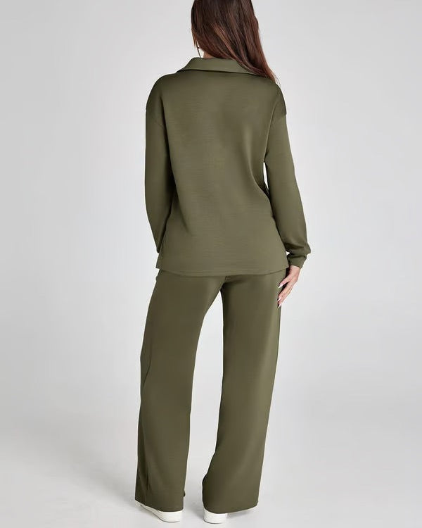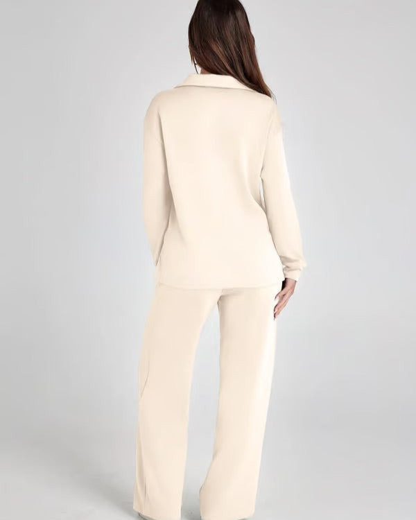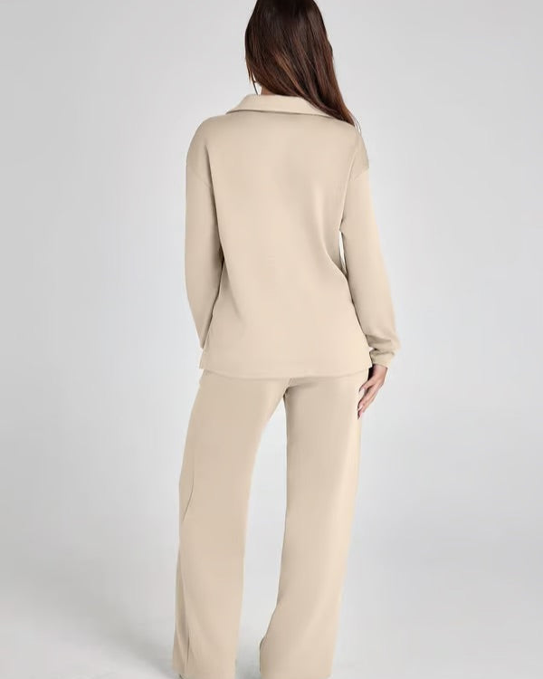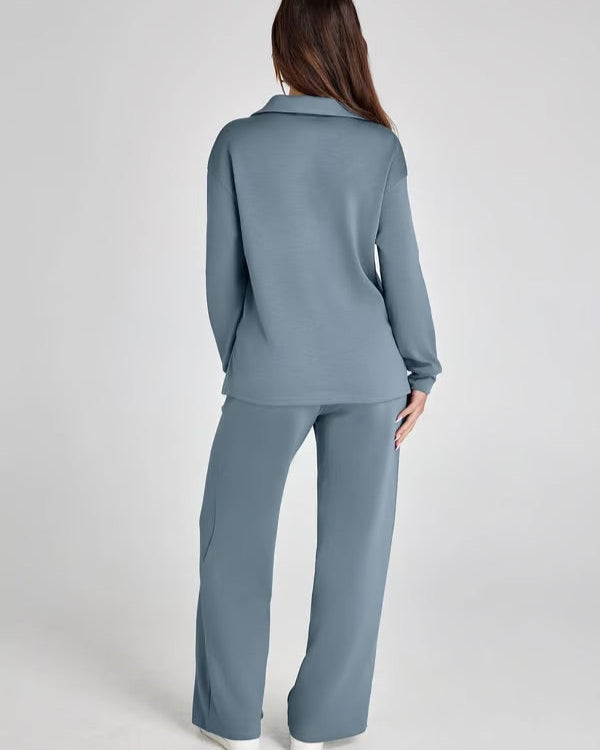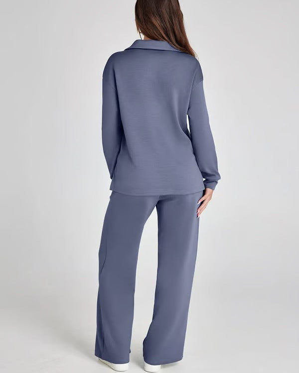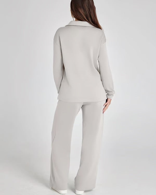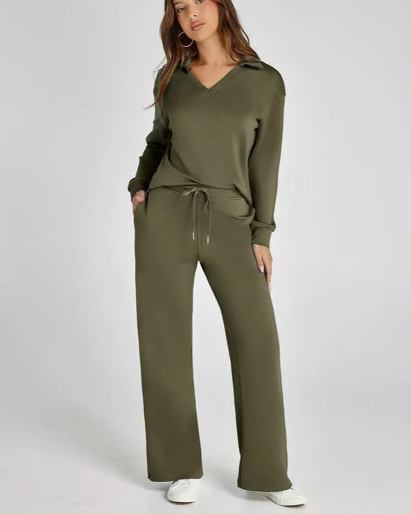 Designed for cooler months, this two-piece set includes a long-sleeve V-neck sweatshirt and wide-leg trousers with an elastic waistband. The regular-length top and loose-fitting pants support unrestricted movement while maintaining a clean, solid-color appearance. Suitable for relaxed settings, errands, or layering for outdoor wear in autumn.