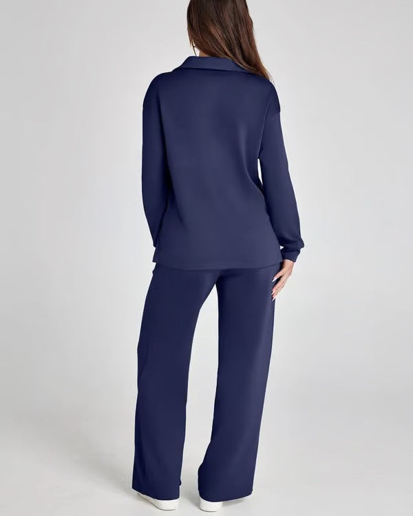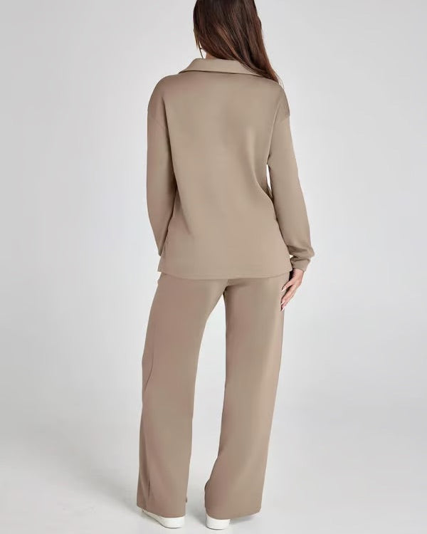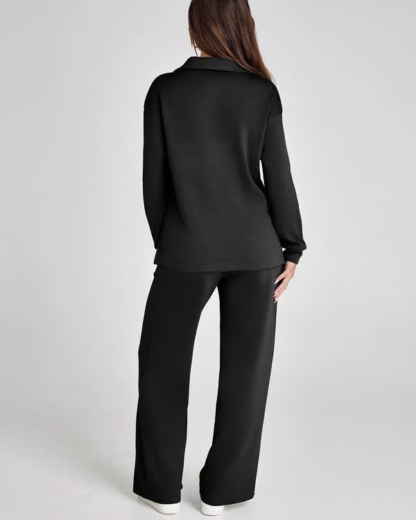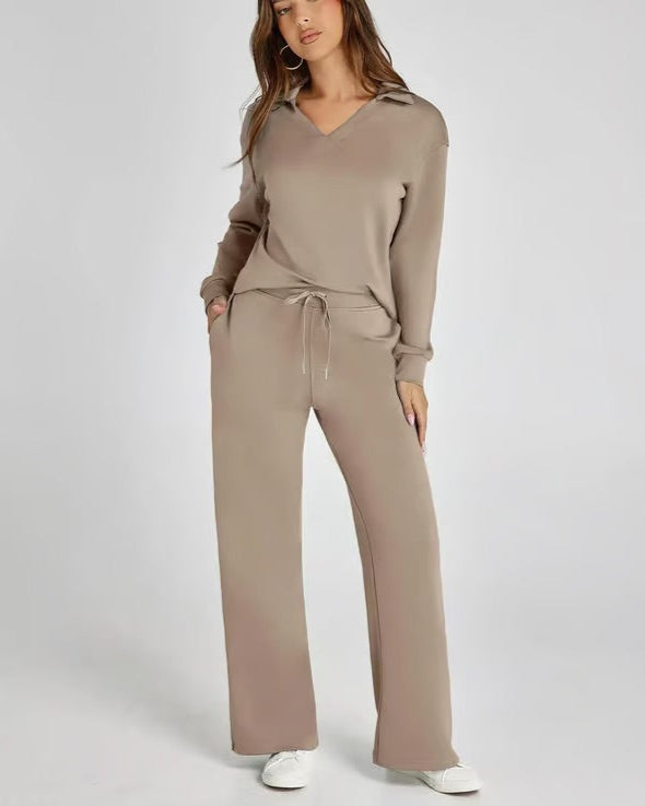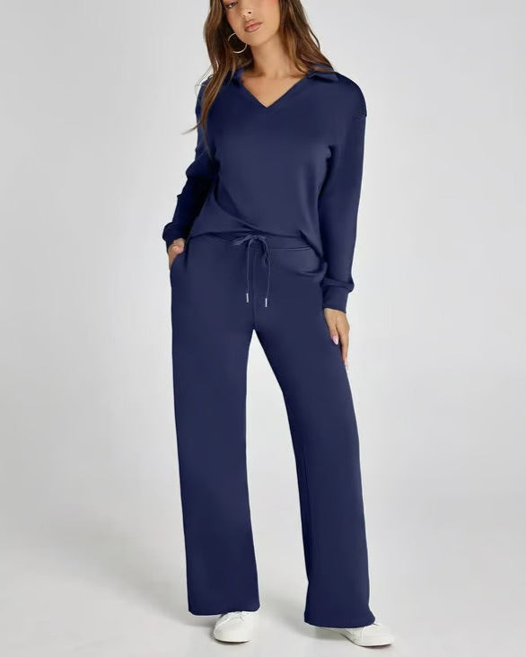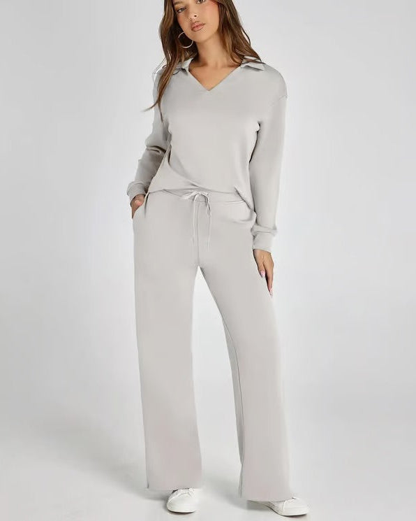 Women Autumn Two-Piece Set With V-Neck Sweatshirt And Wide-Leg Trousers