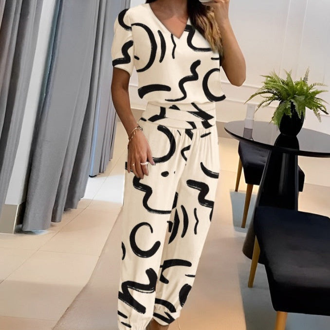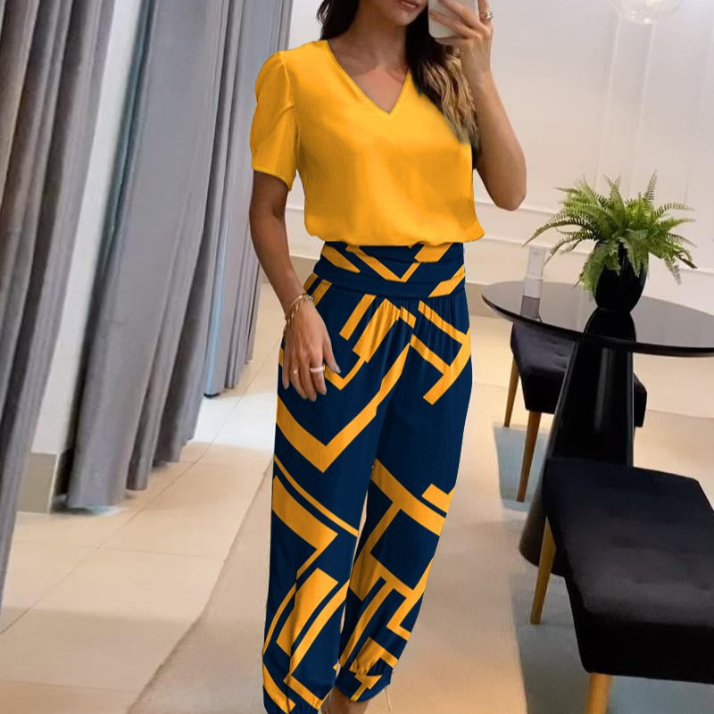 Women’s Short Sleeve Top With Geometric And Stripe Patterns