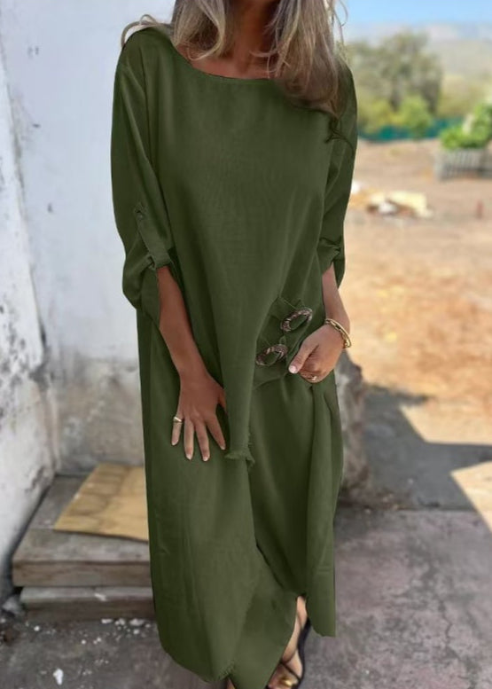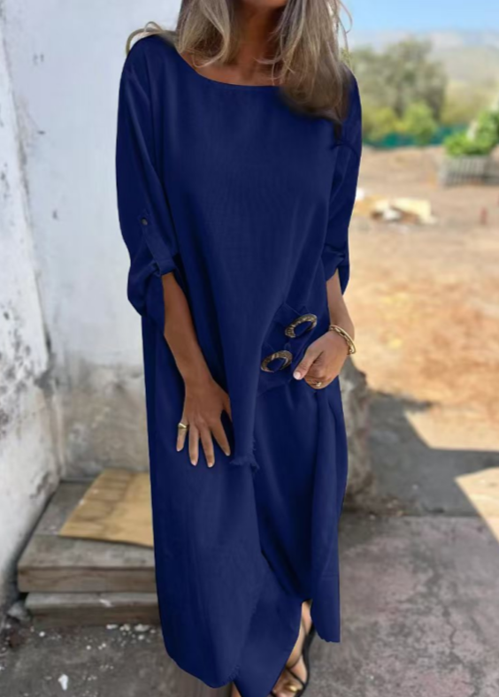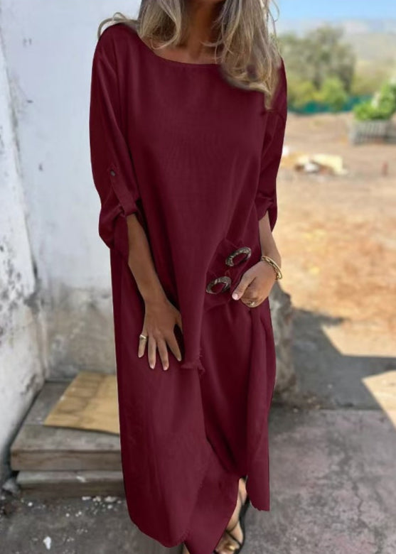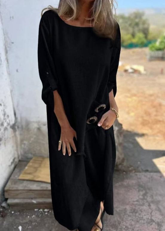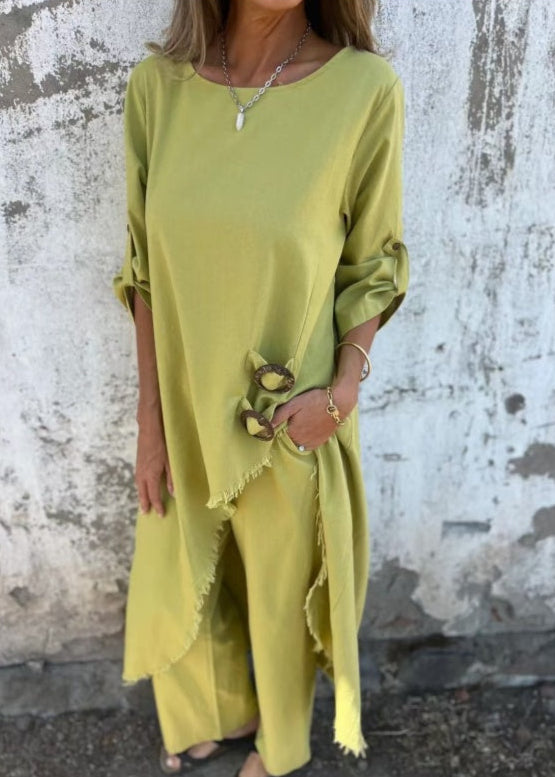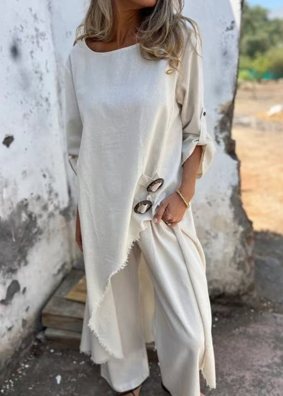 This two piece set includes a long dress paired with matching pants, offering a relaxed fit suitable for warm weather. The flowing silhouette allows ease of movement, while decorative buttons and distinctive sleeve design add detail. Functional side pockets enhance practicality, making this set adaptable for daily wear, outings, or leisure.