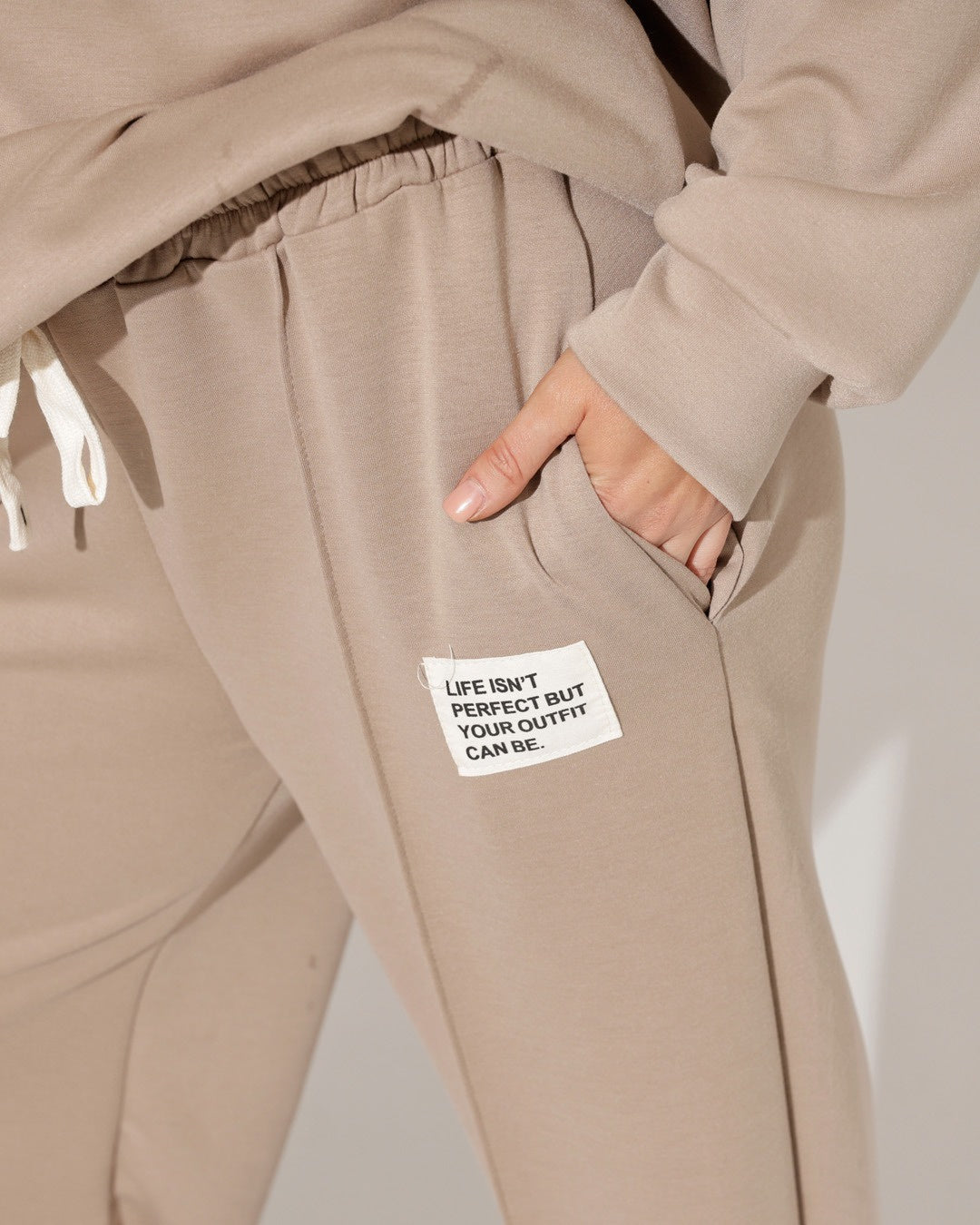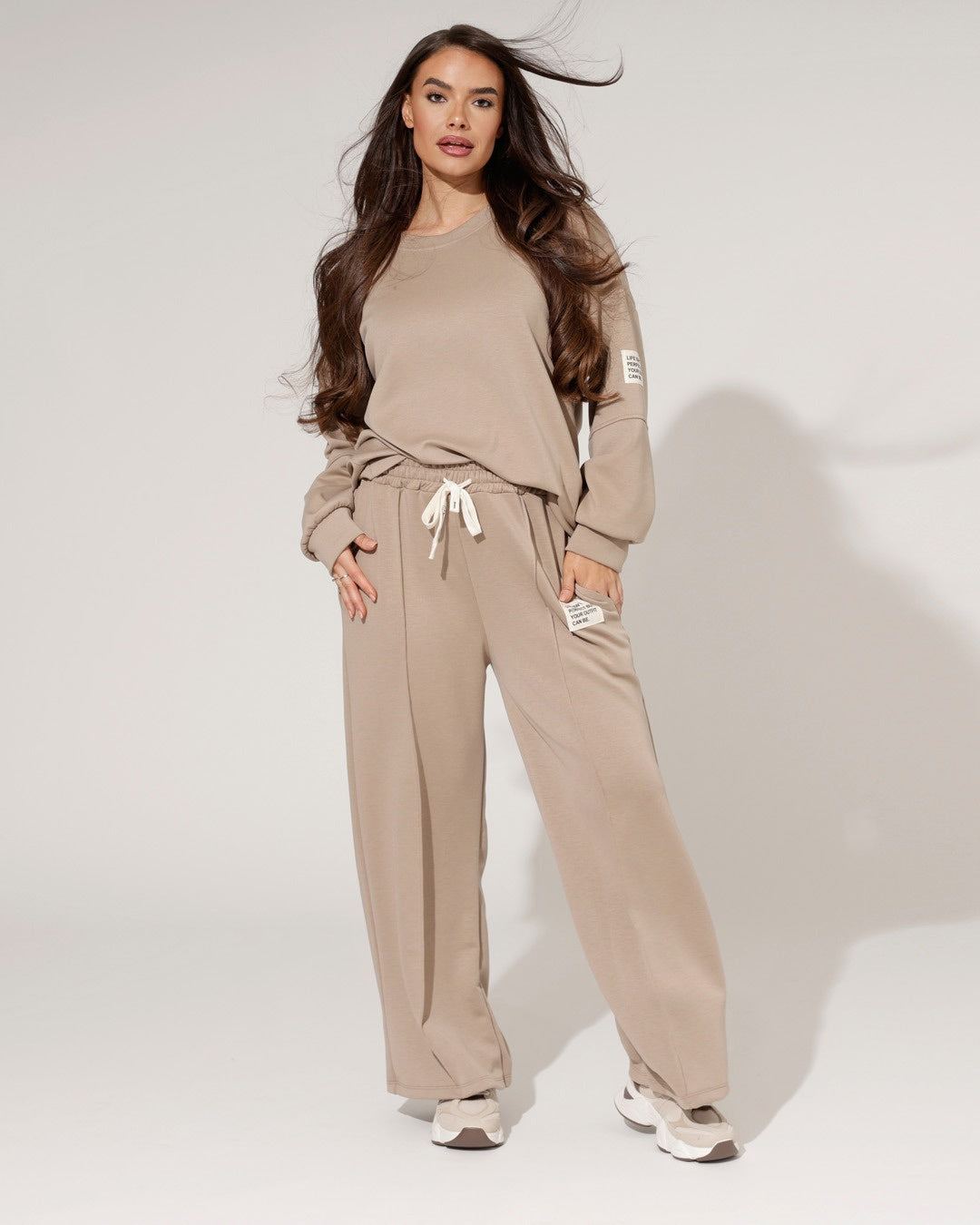 This set includes a relaxed sweater paired with wide-leg trousers, designed with a smooth surface and flexible structure suited for regular indoor or light outdoor wear. The sweater features a small patch with a printed quote for added visual detail, while the trousers maintain a flowing shape that complements the upper piece. The neutral shade supports simple combination options, making the set practical for varied daily routines. Both pieces are shaped to allow ease of movement and can be worn together as a coordinated outfit or paired separately with other wardrobe items.