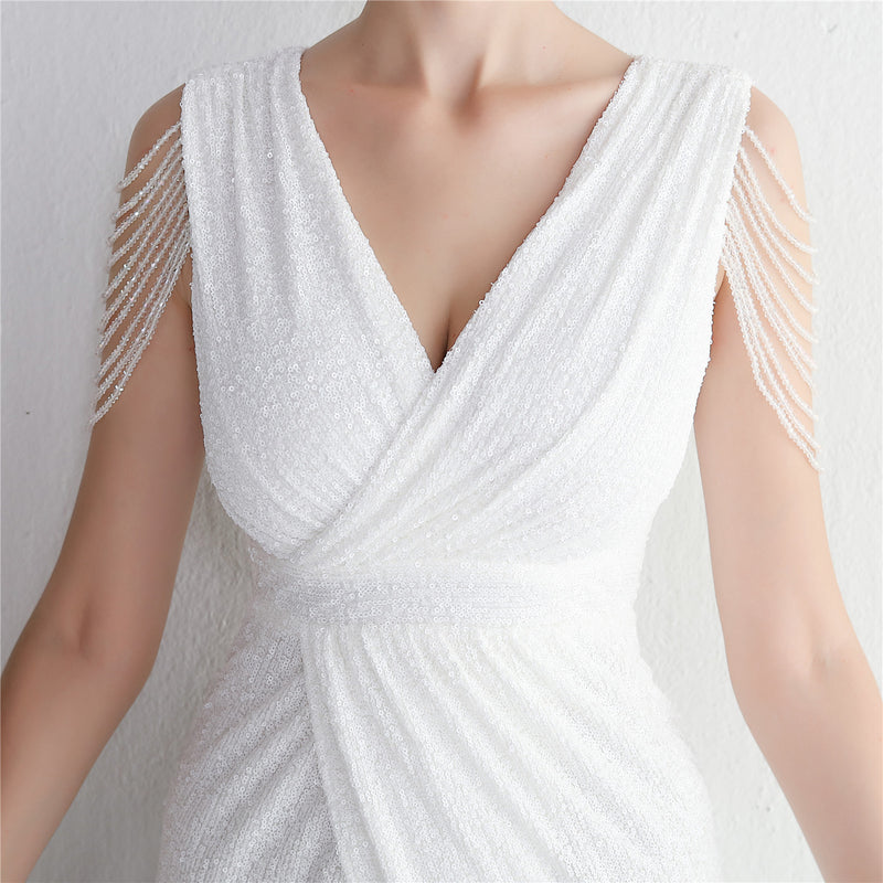 This evening dress features intricate beadwork paired with a slim, figure-enhancing fit and a V-neckline. Designed for formal occasions, it offers a sophisticated silhouette suitable for banquets, special events, and evening wear. Available in multiple colors to fit different preferences.