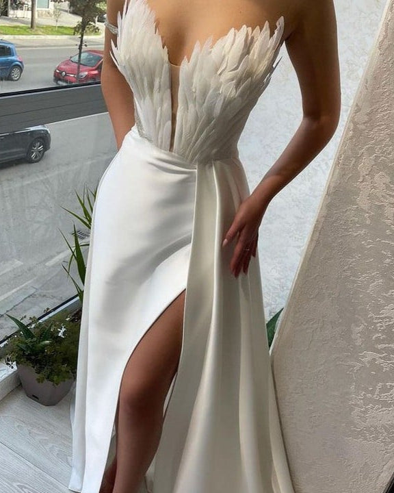 This floor-length dress features a sleeveless silhouette and a line collar that enhances the neckline. Feather trim detailing adds texture and movement to the design. The dress offers a secure fit suitable for formal events, parties, and evening gatherings. Available in sky blue, rose red, and white.