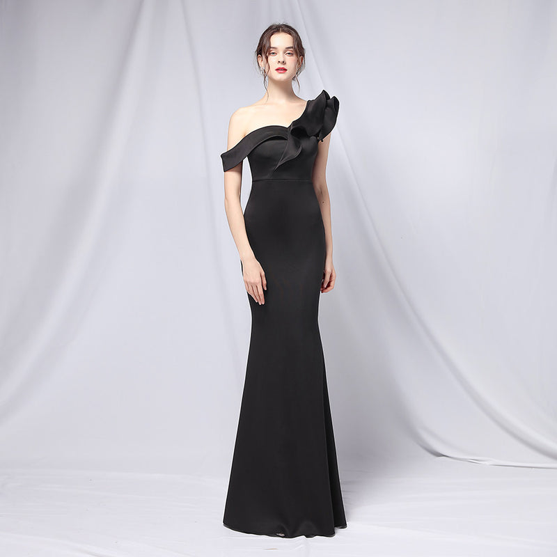 This evening dress features a fishtail silhouette that enhances the natural shape, offering a refined look for formal occasions such as weddings, gala dinners, and evening events. Designed with a smooth lining and a structured fit, the dress balances elegance with a polished appearance. Available in multiple rich colors, it provides versatility for autumn and winter events requiring a sophisticated dress.