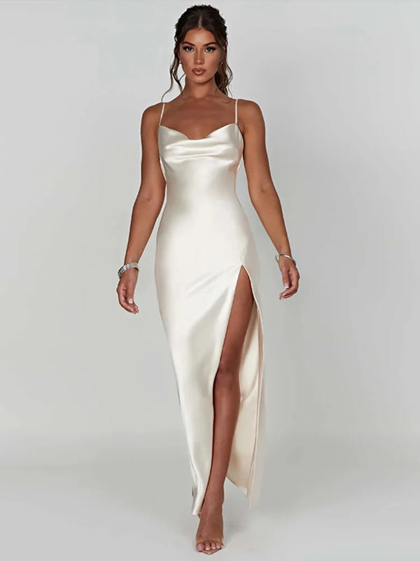 Woman Spring and Summer Satin Backless Maxi Dress with Spaghetti Straps, Empire Waist, and High Slit