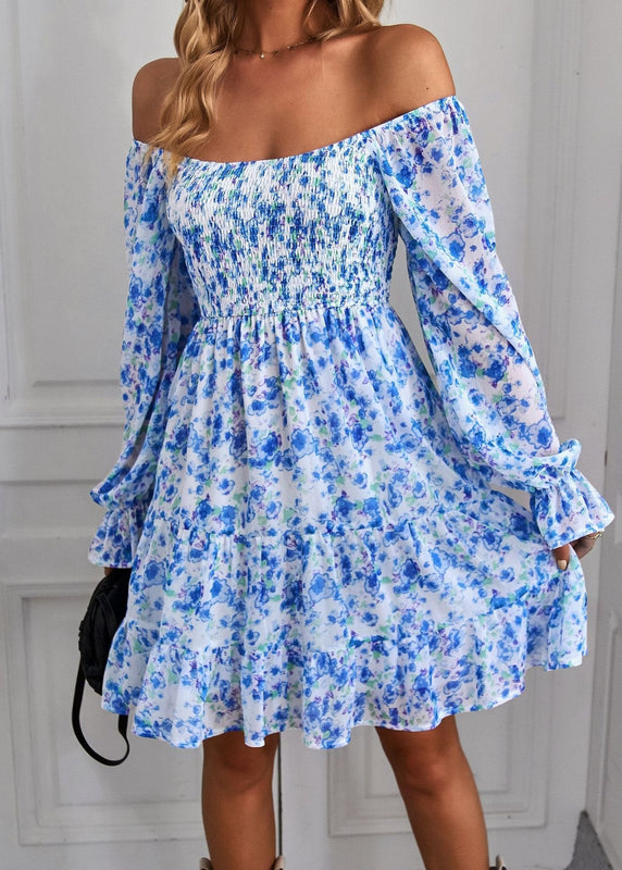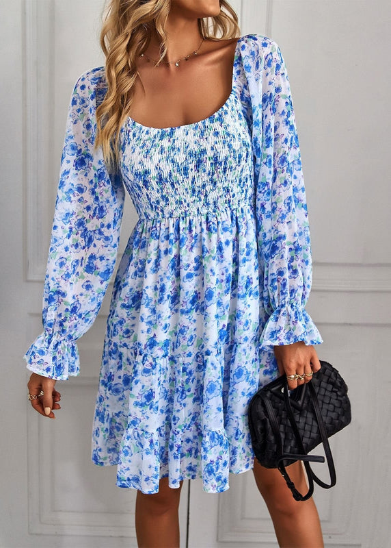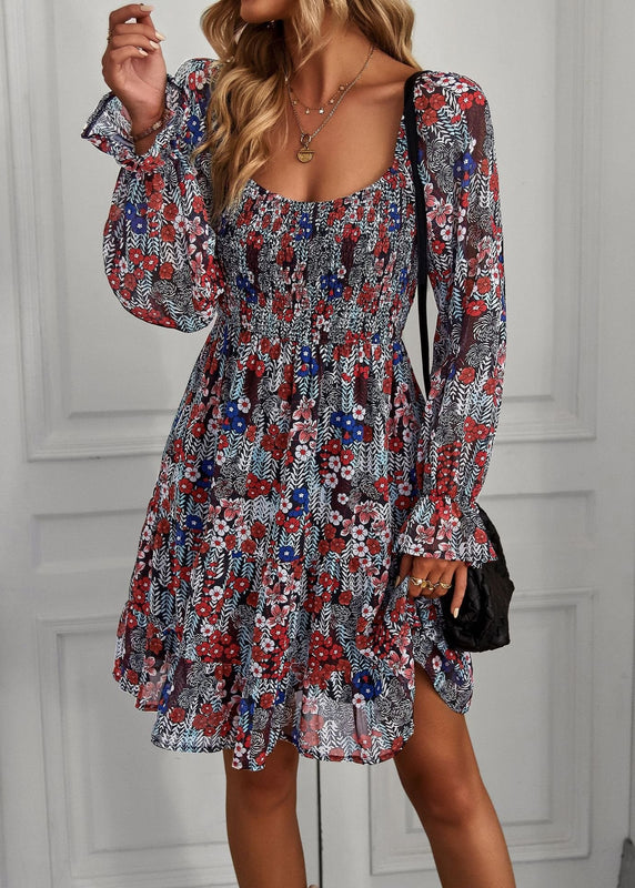 This midi dress features a U-shaped neckline and long ruffle sleeves, complemented by a fitted waist and flowing skirt. The floral print adds seasonal detail, making it suitable for spring and summer occasions. Constructed with lightweight fabric, the dress offers breathability for day-to-evening wear. Available in multiple sizes and colors.