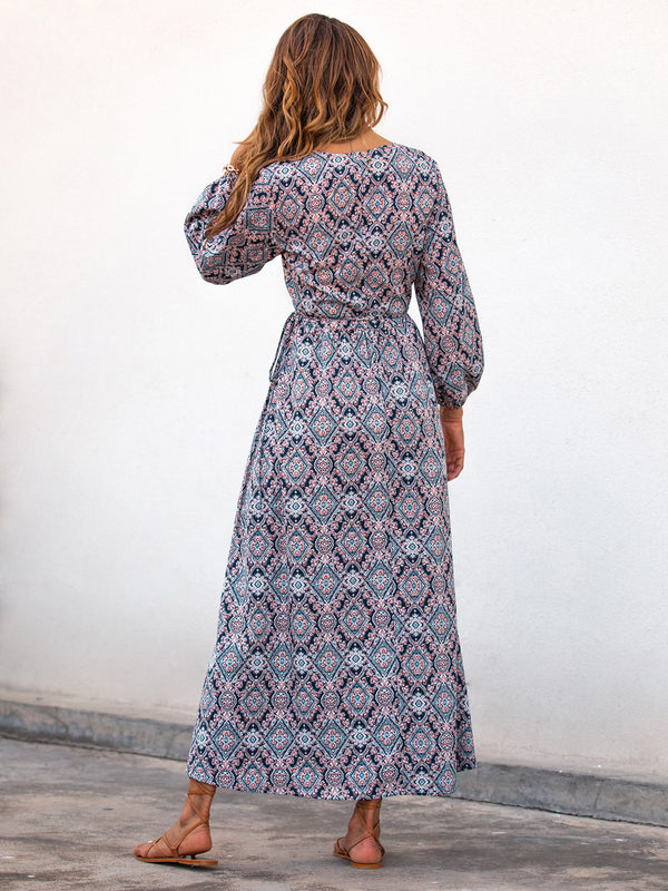 Woman Spring and Autumn Long Dress with V-Neckline and Lantern Sleeves