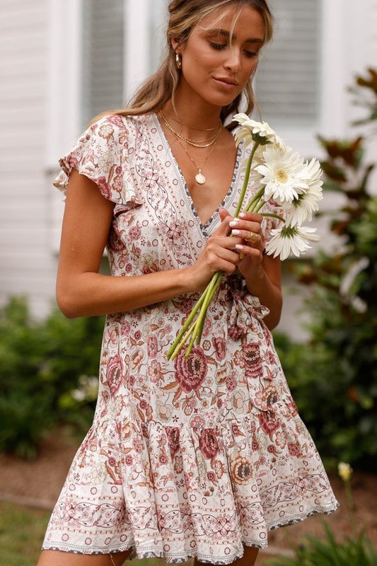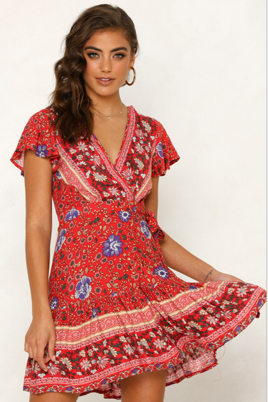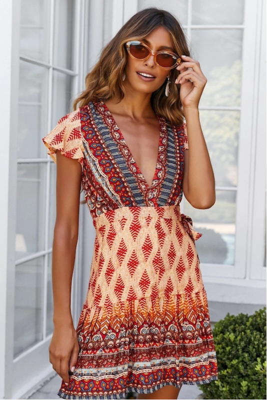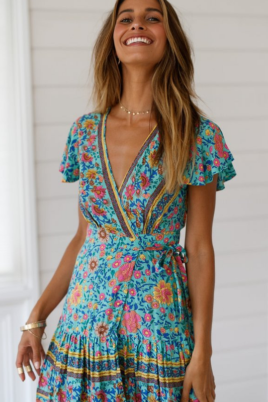 This summer dress features a V-neckline and short sleeves designed for warm weather. The high waist creates a defined silhouette, while the irregular hem adds visual movement to the design. Made from lightweight, breathable fabric, the dress is suitable for various summer activities and pairs well with sandals or flats.