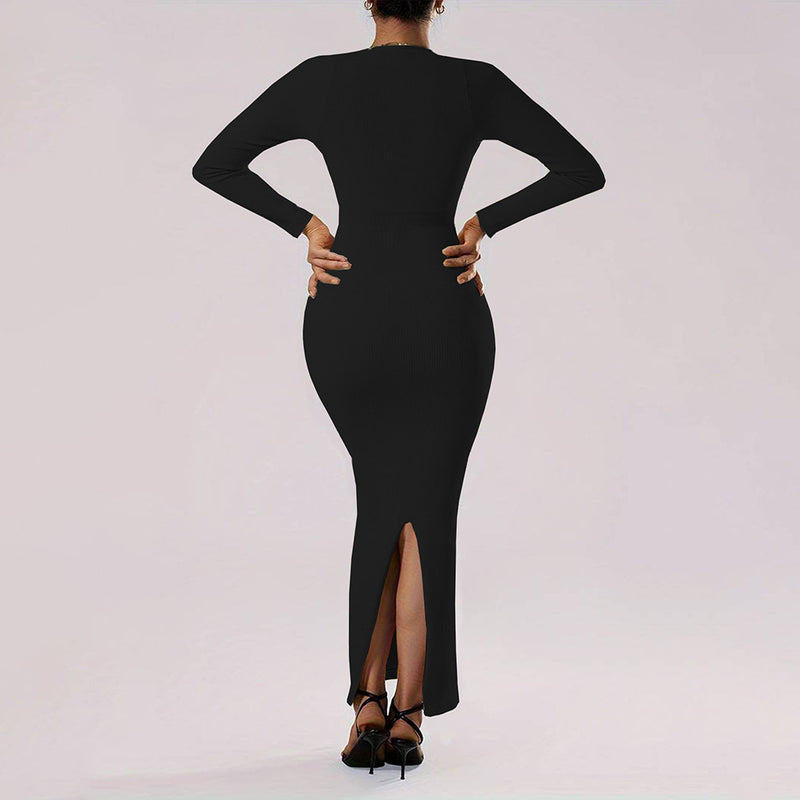 Designed for cooler seasons, this sheath dress features a structured square neckline and long sleeves for added coverage. The slim-fitting silhouette is complemented by a high-waist cut, creating a streamlined appearance. With its longer skirt length and form-fitting shape, this dress is suitable for both professional and social settings. Available in multiple sizes, it offers a clean and defined seasonal option.