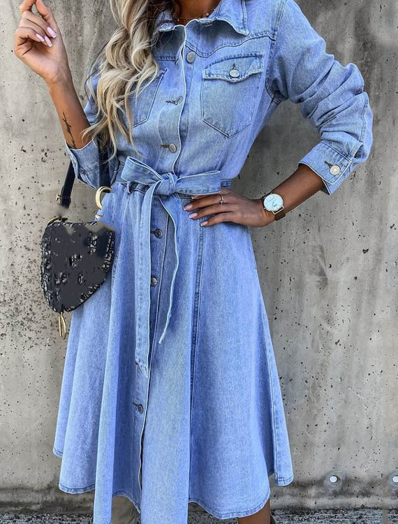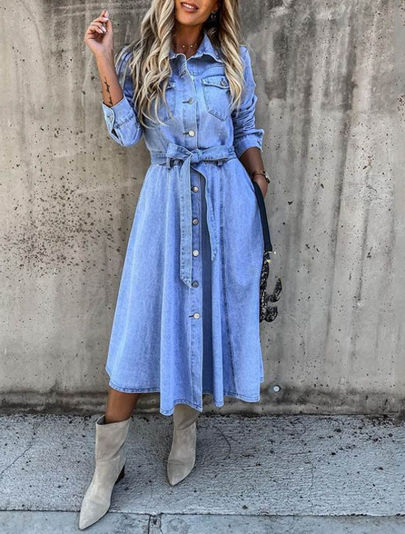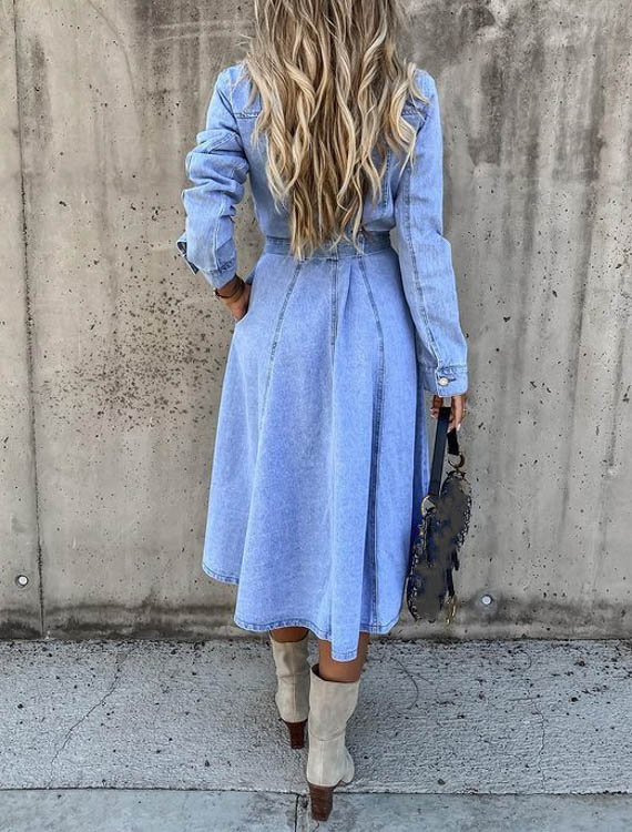 This Spring Denim Midi Shirt Dress features a classic shirt collar and button-up front for a structured look. The flared silhouette provides a relaxed yet tailored fit, while the long sleeves offer coverage suitable for transitional weather. Functional side pockets add convenience without altering the refined design, making this dress adaptable for work or everyday use.