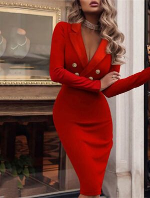This Autumn Midi Pencil Dress features a tailored fit designed to create a structured silhouette. The deep V-neckline adds definition to the upper body, while long sleeves offer additional coverage for cooler temperatures. Decorative buttons along the front enhance the overall appearance with a refined element, making the dress suitable for formal or professional settings.