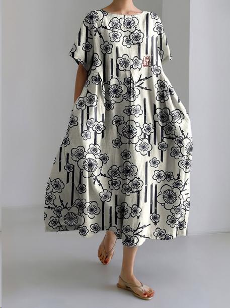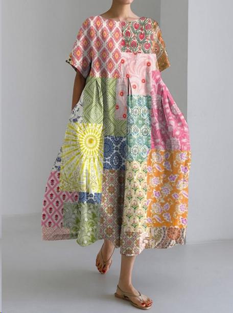 Long A-line dress featuring a floral print and short sleeves. Designed with a high waist for a defined fit and a pullover style for easy wear. The skirt extends to full length, offering a flowing silhouette suitable for various occasions. Available in a wide range of sizes from S to 5XL and multiple color variations.