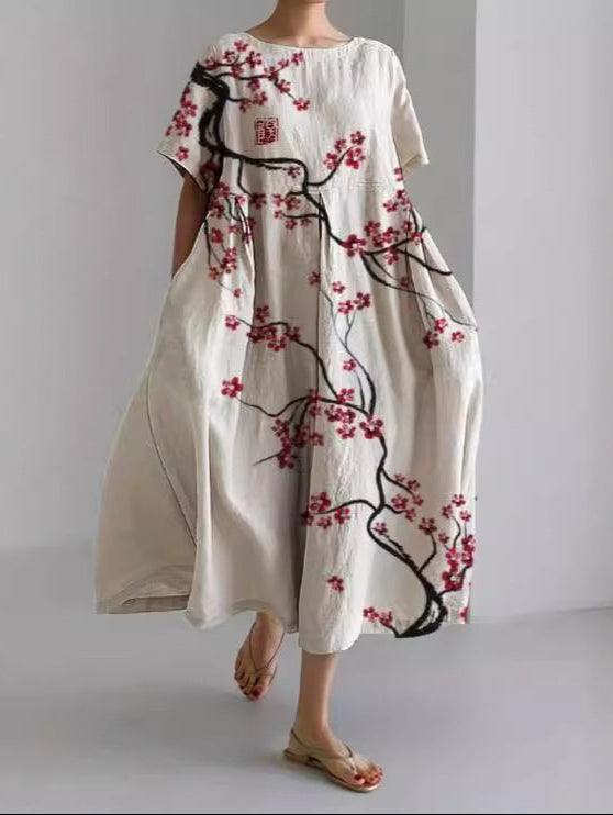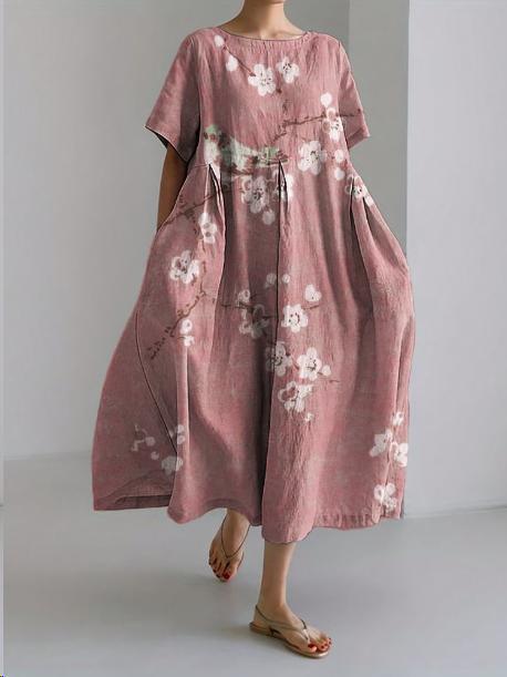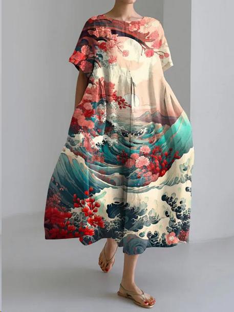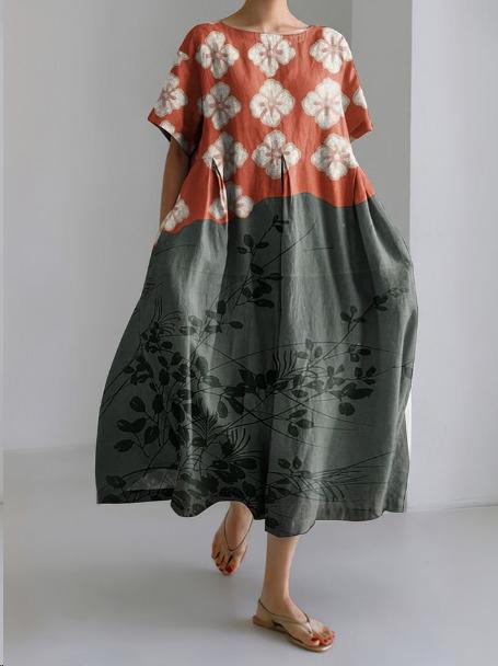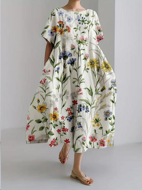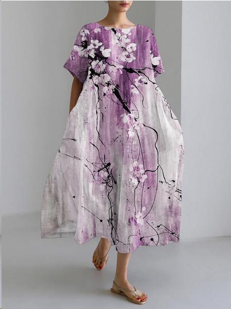 Women's Long Dress Floral Print Short Sleeve High Waist A-Line Pullover