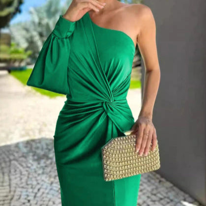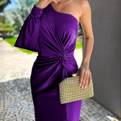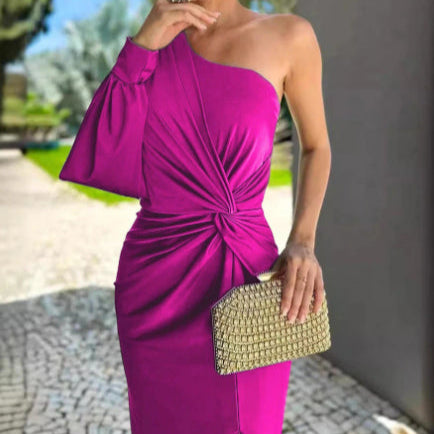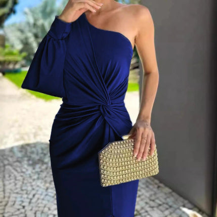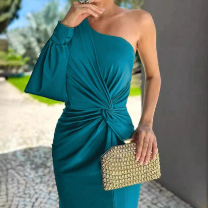 Sleeveless long dress featuring a diagonal shoulder design with a knotted detail for added visual interest. Made in a solid color with a side split for ease of movement and a slim-fit silhouette that follows the body’s shape. The mid-waist cut and pullover style provide a streamlined, single-piece look suitable for various occasions.