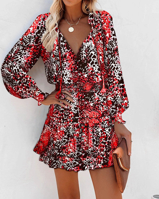 Woman Spring Floral Patchwork Dress with Puff Long Sleeves and Waist Tie