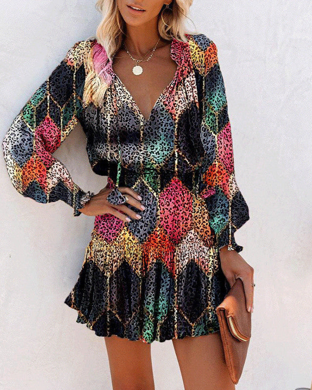 This floral patchwork dress features puff long sleeves and a defined waist with a tie detail for silhouette shaping. The dress combines an all-over floral print with contrast stitching for added texture. Designed for transitional spring wear, it offers a balance of coverage and style suitable for daily or semi-formal occasions. Available in sizes S to 2XL, it pairs well with boots or flats.